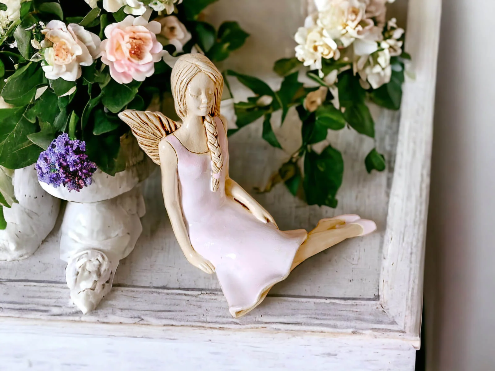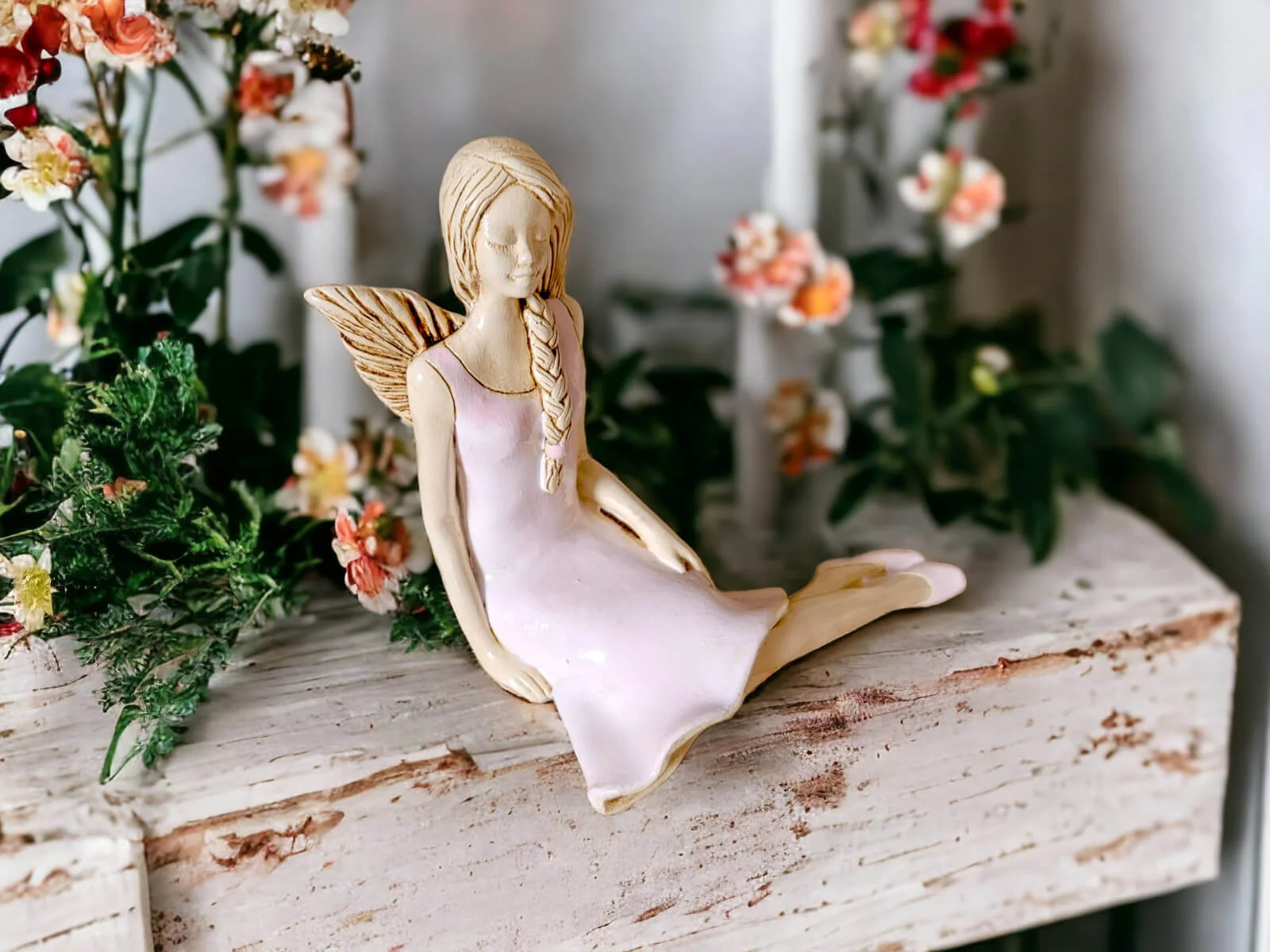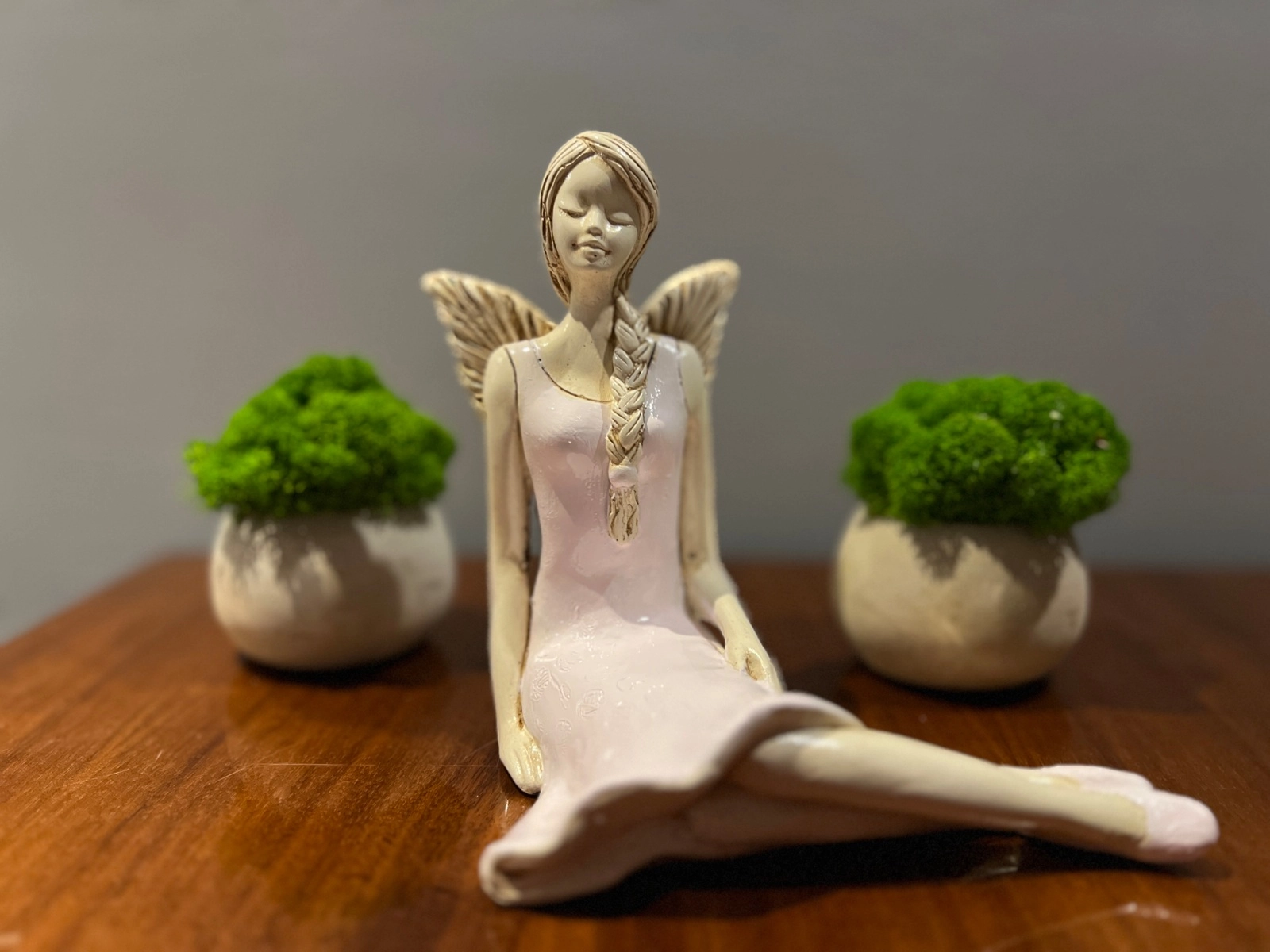 Aniołek Matilda to gipsowa figurka wykonany ręcznie. Przedstawia dziewczynkę, która siedzi z dostojnie ułożonymi nogami w lewą stronę. Ubrana jest w różową sukienkę i różowe buciki. Na lewym ramieniu położony jest długi, jasny warkocz związany różową gumką. Z tyłu wystają małe skrzydła skierowane do góry. Ręce są ułożone wzdłuż sylwetki. Dekoracja jest przeznaczona dla dziewczynek i kobiet w każdym wieku. Może idealnie służyć jako piękny prezent lub ozdoba każdego wnętrza.