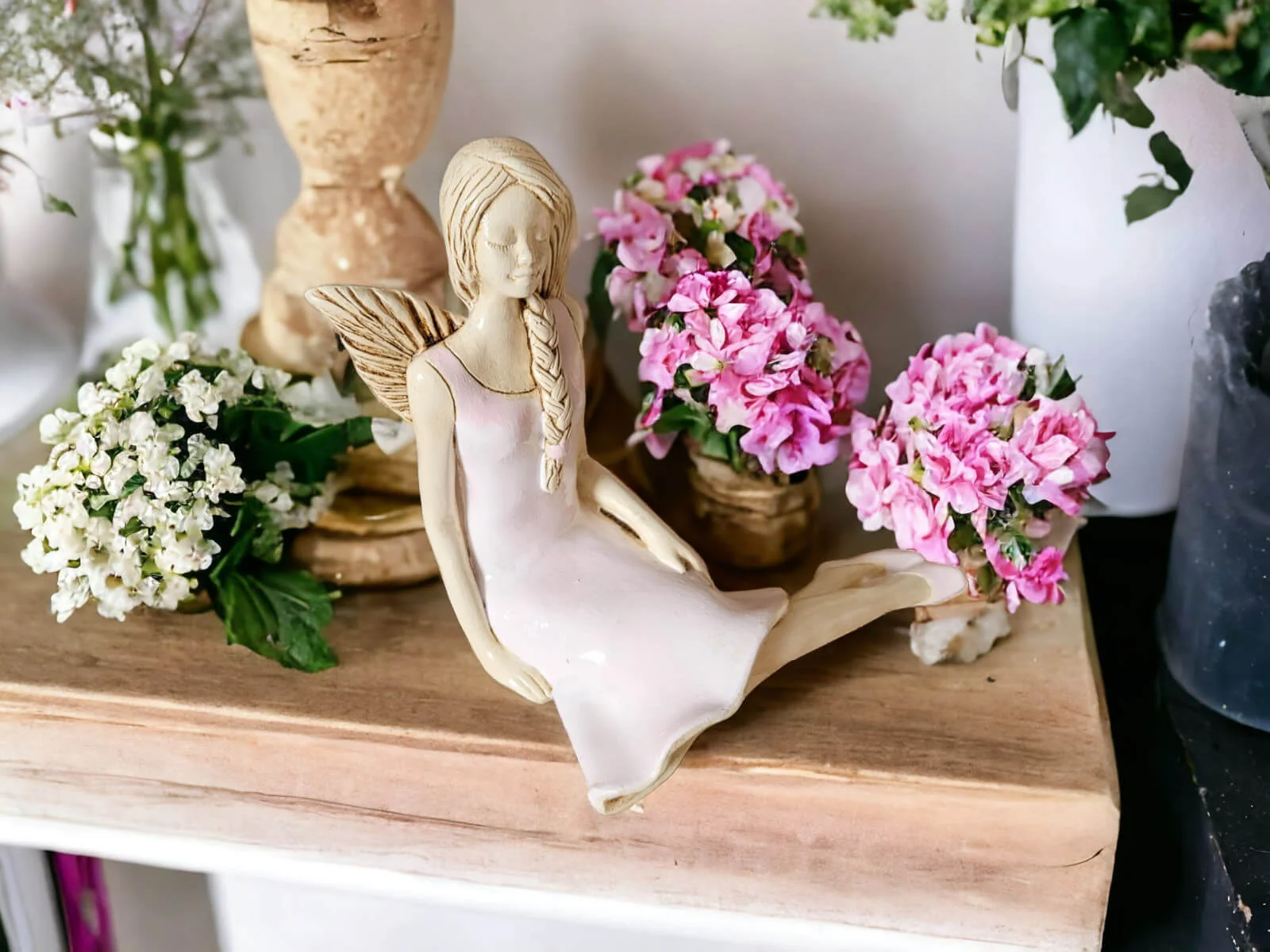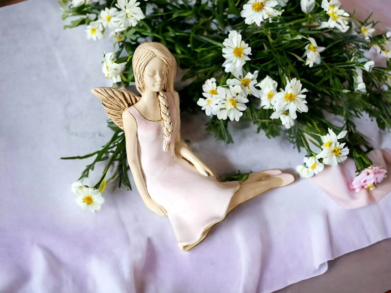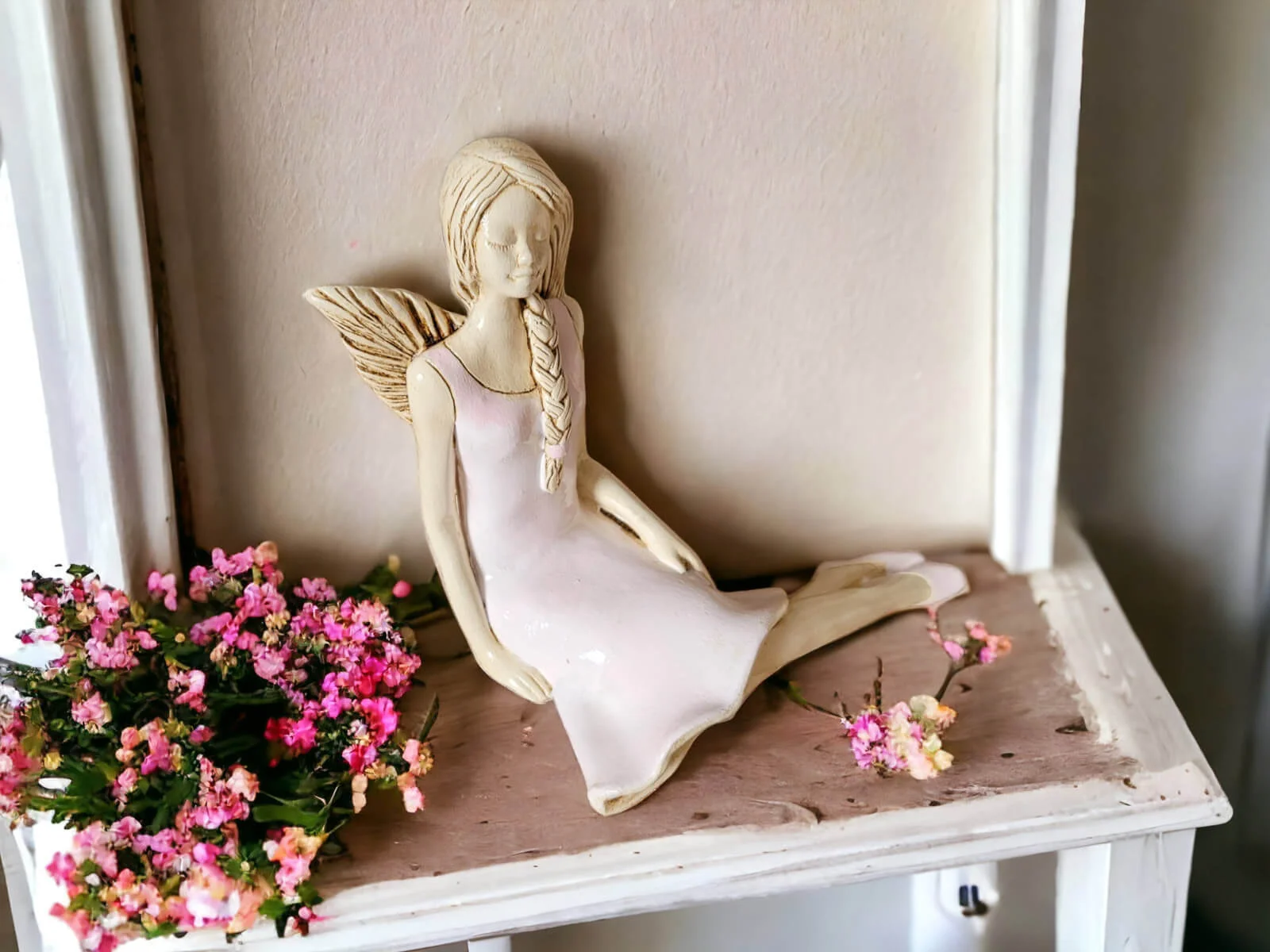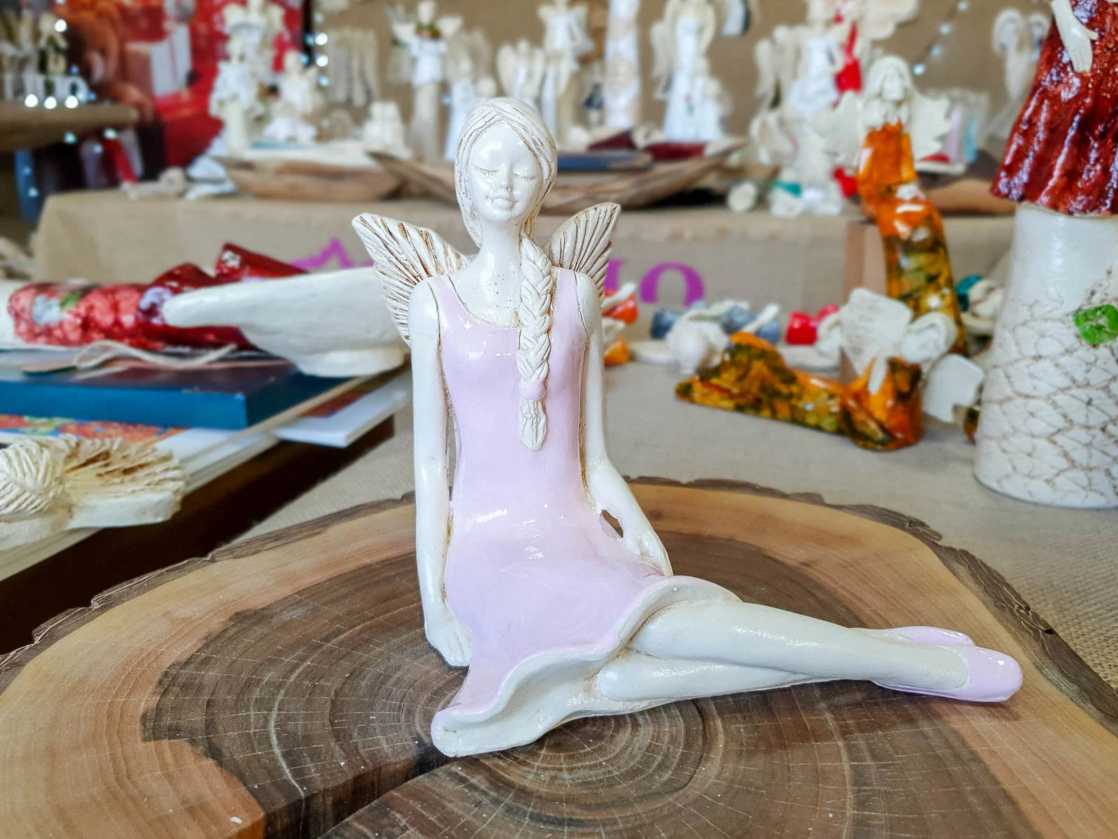 Aniołek Matilda to gipsowa figurka wykonany ręcznie. Przedstawia dziewczynkę, która siedzi z dostojnie ułożonymi nogami w lewą stronę. Ubrana jest w różową sukienkę i różowe buciki. Na lewym ramieniu położony jest długi, jasny warkocz związany różową gumką. Z tyłu wystają małe skrzydła skierowane do góry. Ręce są ułożone wzdłuż sylwetki. Dekoracja jest przeznaczona dla dziewczynek i kobiet w każdym wieku. Może idealnie służyć jako piękny prezent lub ozdoba każdego wnętrza.