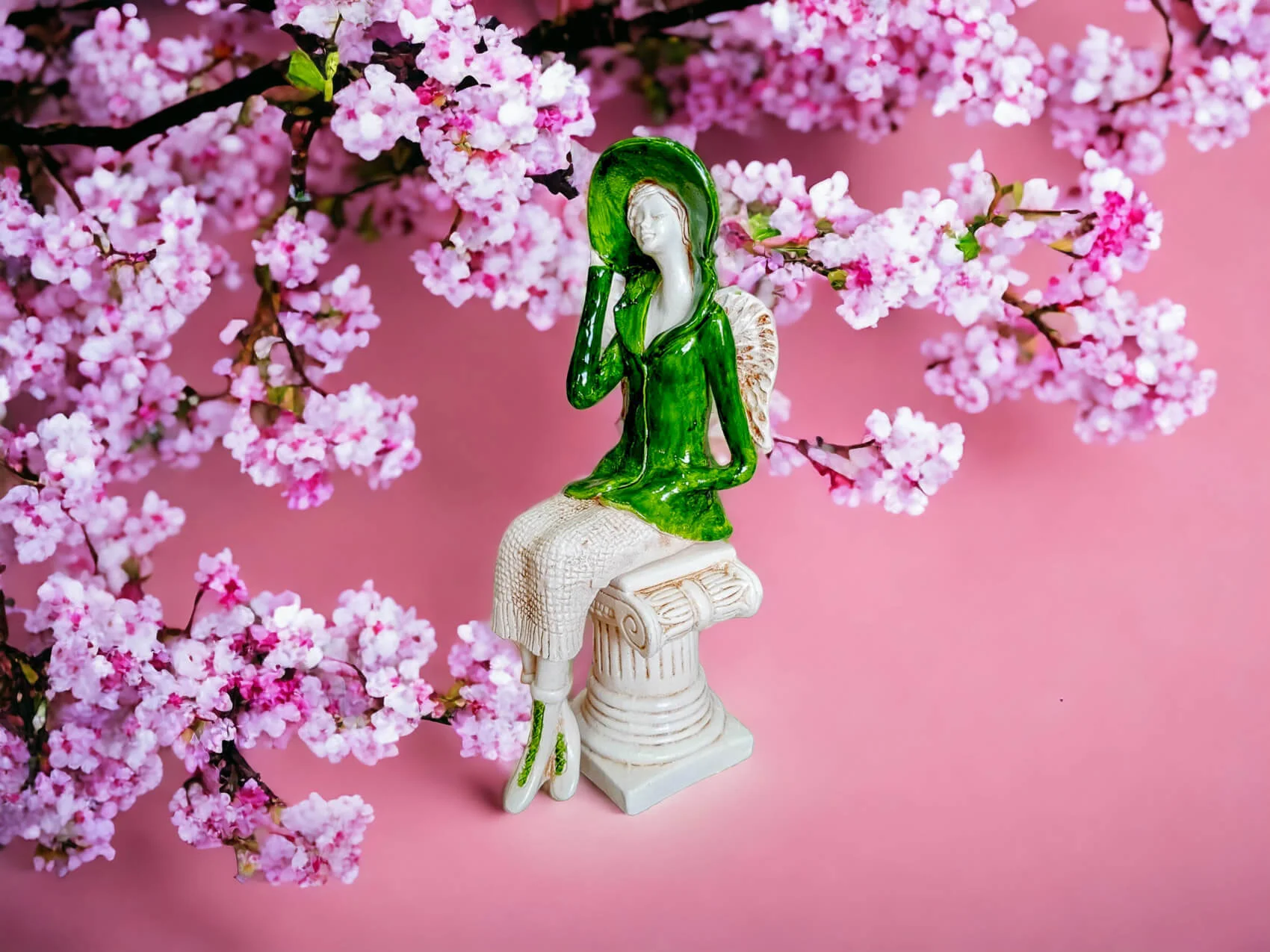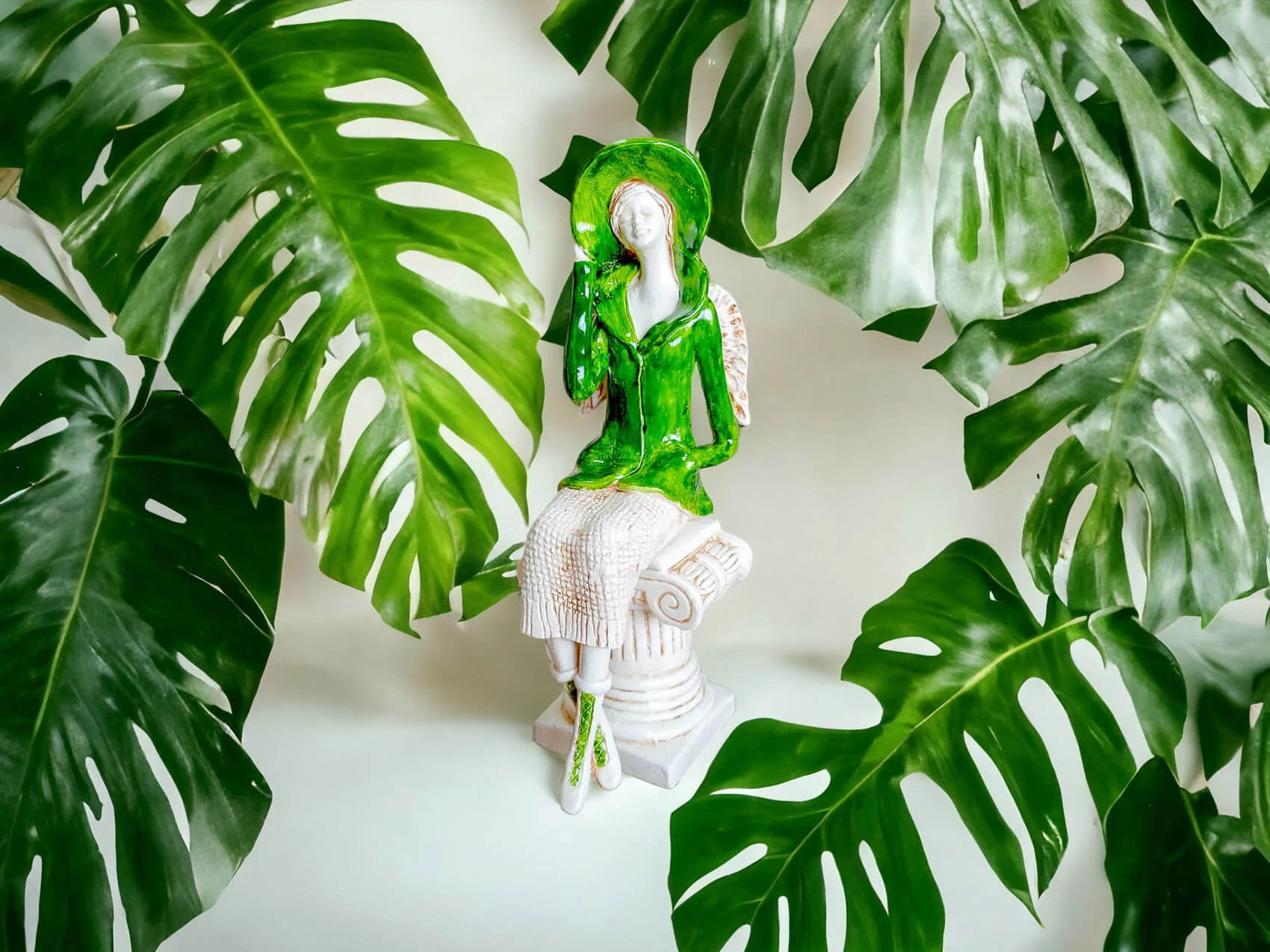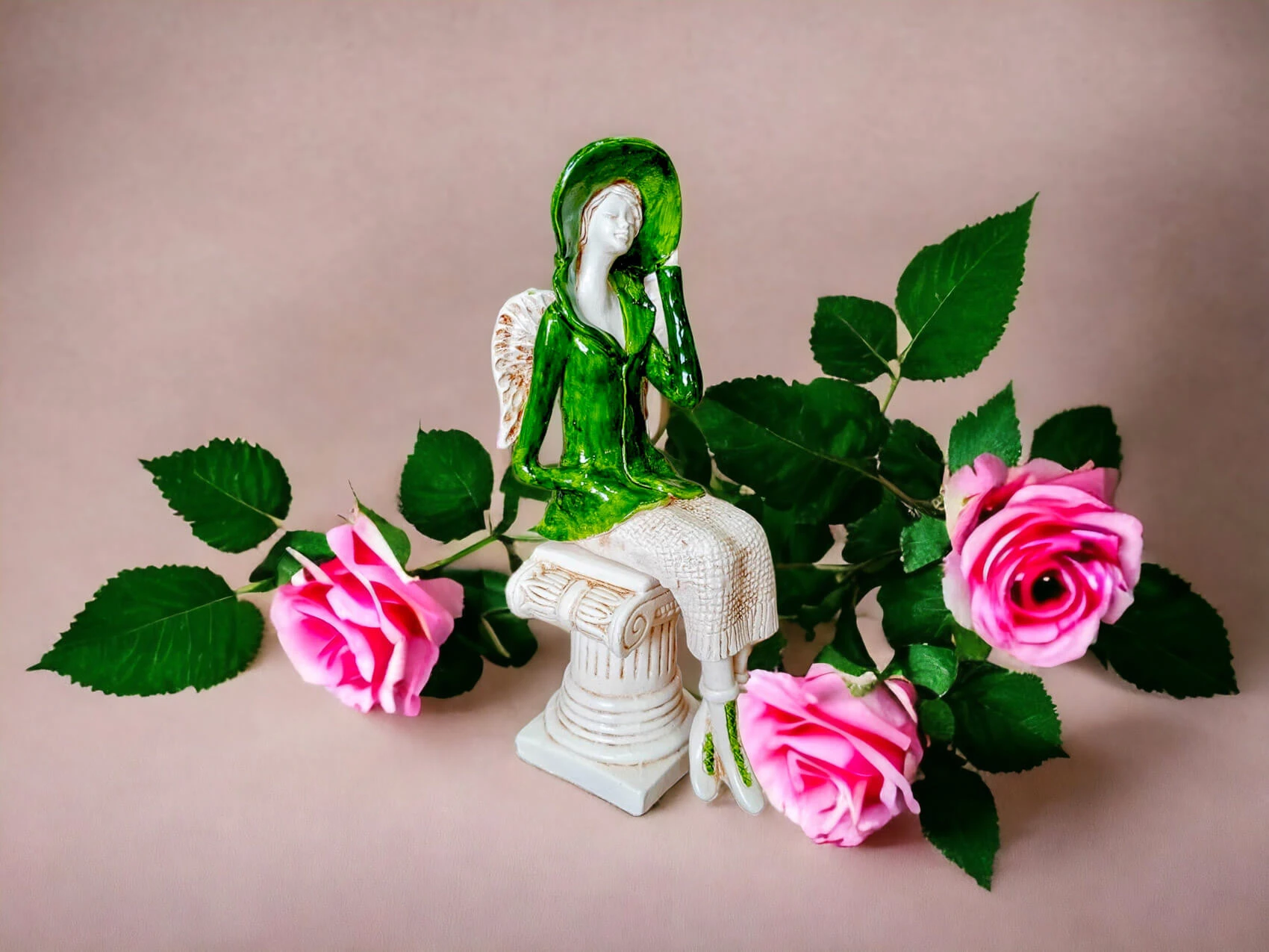 Aniołek Megan to urocza figurka przedstawiająca siedzącą kobietę, która zachwyca elegancją i dbałością o detale. Megan ubrana jest w zielony żakiet i pasujący kapelusz, a także beżową spódnicę z delikatnym, sweterkowym motywem. Jej krótkie, jasne włosy oraz małe skrzydła dodają jej subtelnego uroku. Lewą rękę trzyma na rogu kapelusza, a prawą w kieszeni żakietu, co nadaje figurce naturalności i swobody.