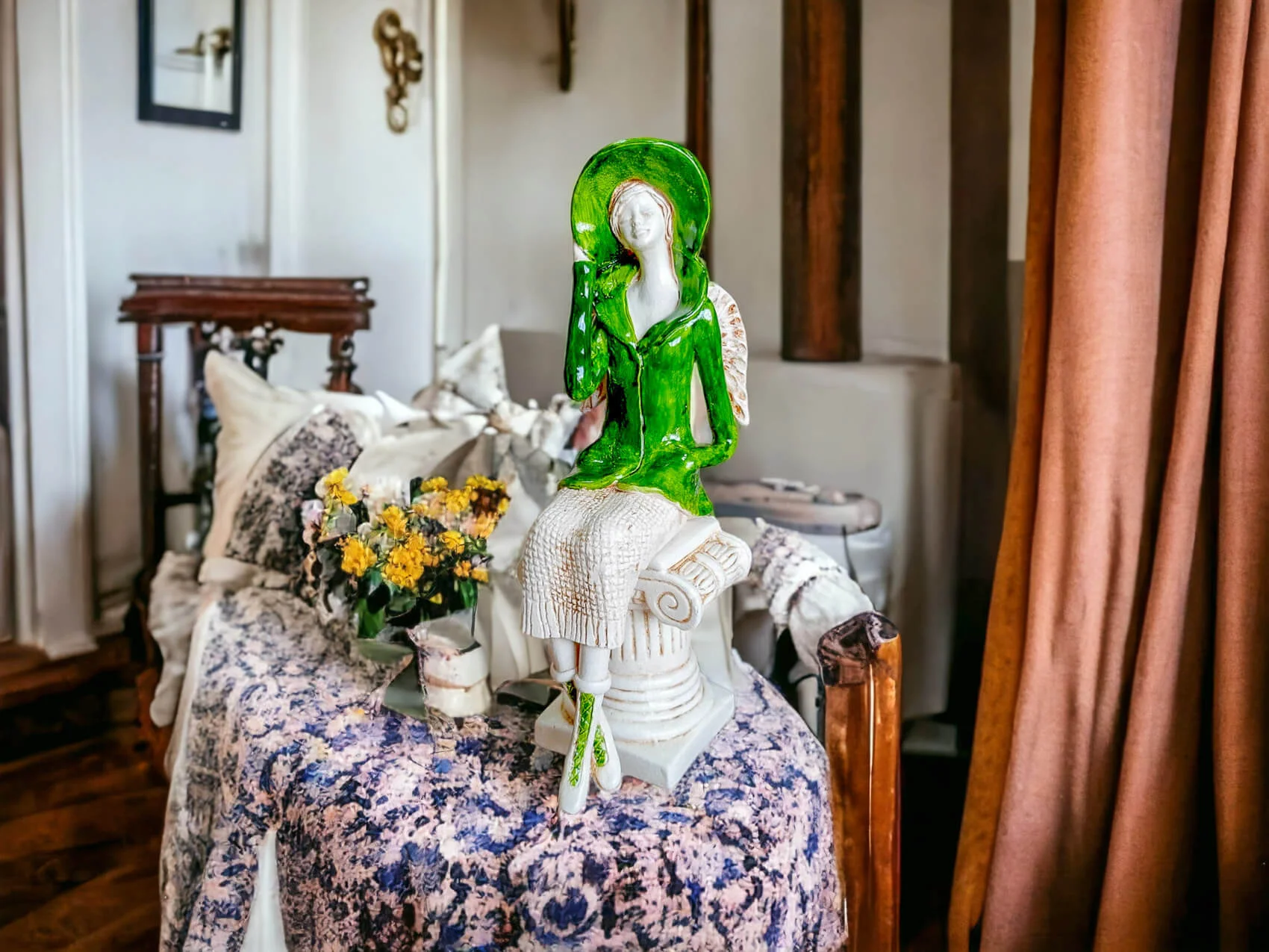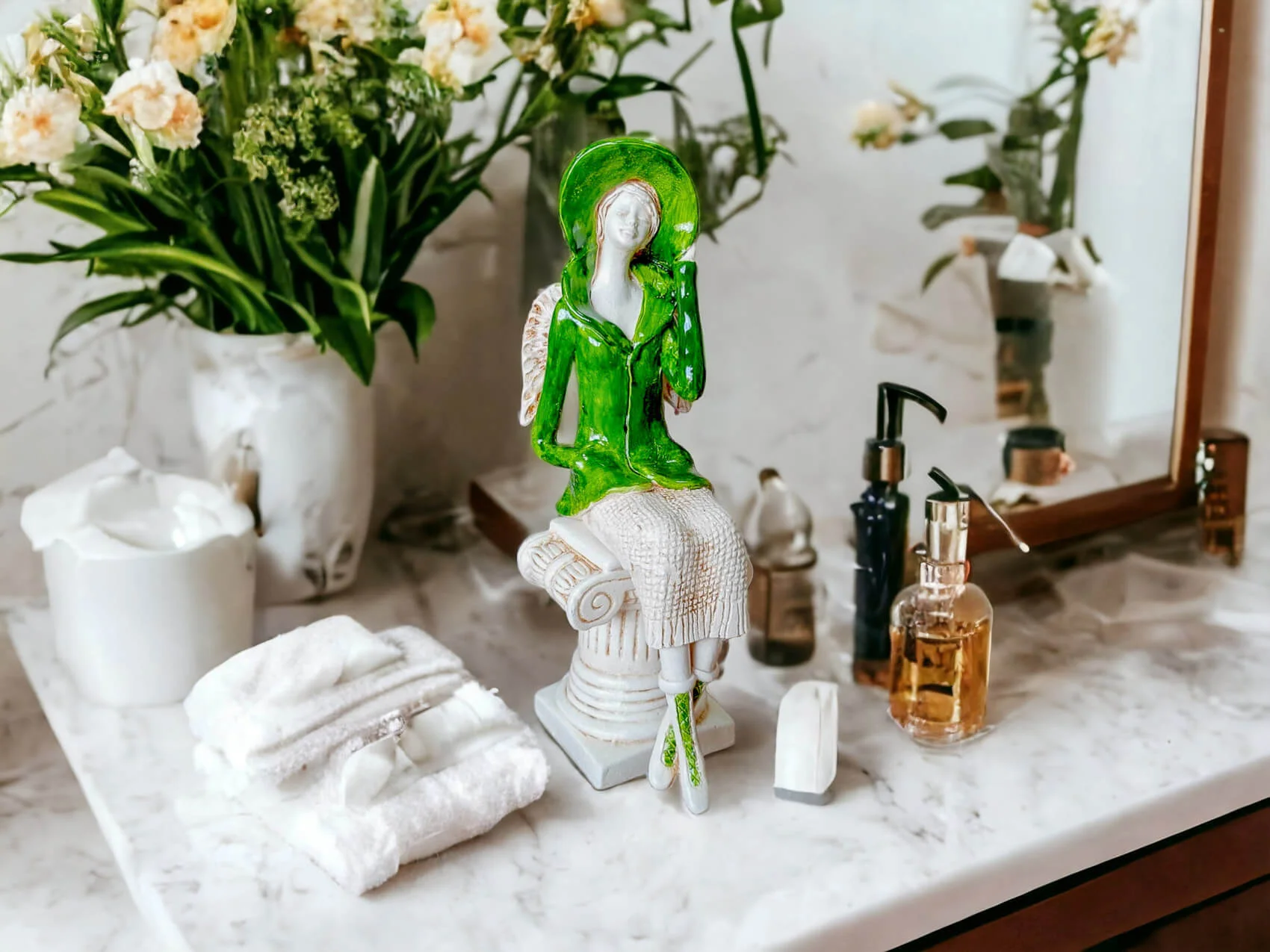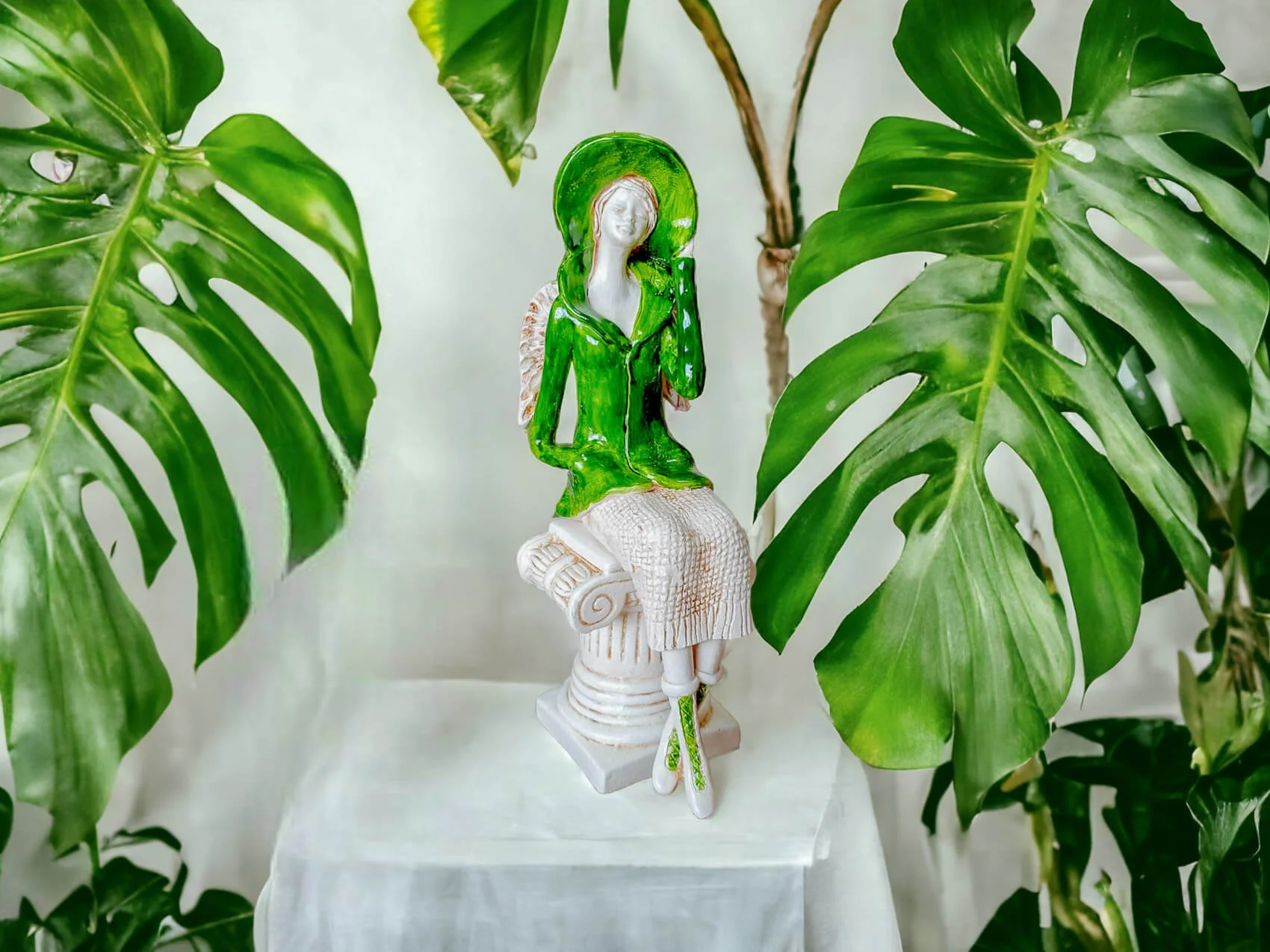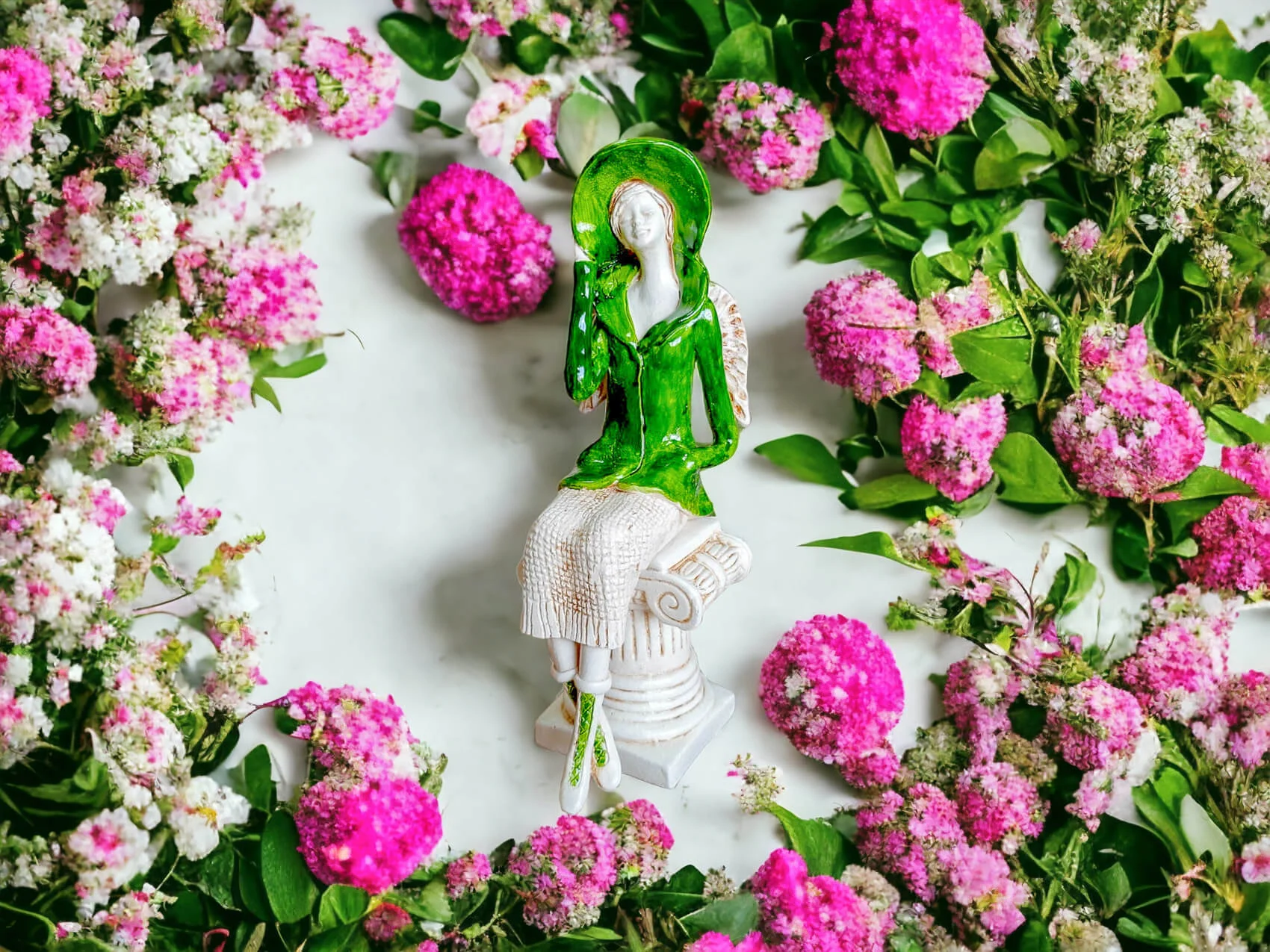 Aniołek Megan to urocza figurka przedstawiająca siedzącą kobietę, która zachwyca elegancją i dbałością o detale. Megan ubrana jest w zielony żakiet i pasujący kapelusz, a także beżową spódnicę z delikatnym, sweterkowym motywem. Jej krótkie, jasne włosy oraz małe skrzydła dodają jej subtelnego uroku. Lewą rękę trzyma na rogu kapelusza, a prawą w kieszeni żakietu, co nadaje figurce naturalności i swobody.