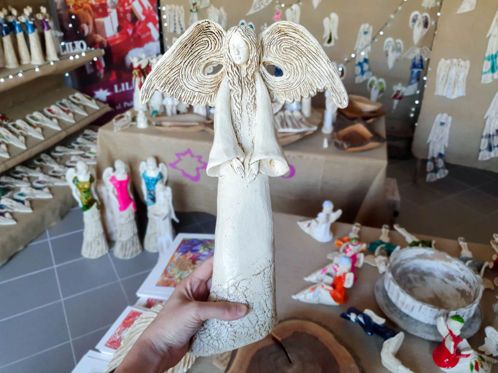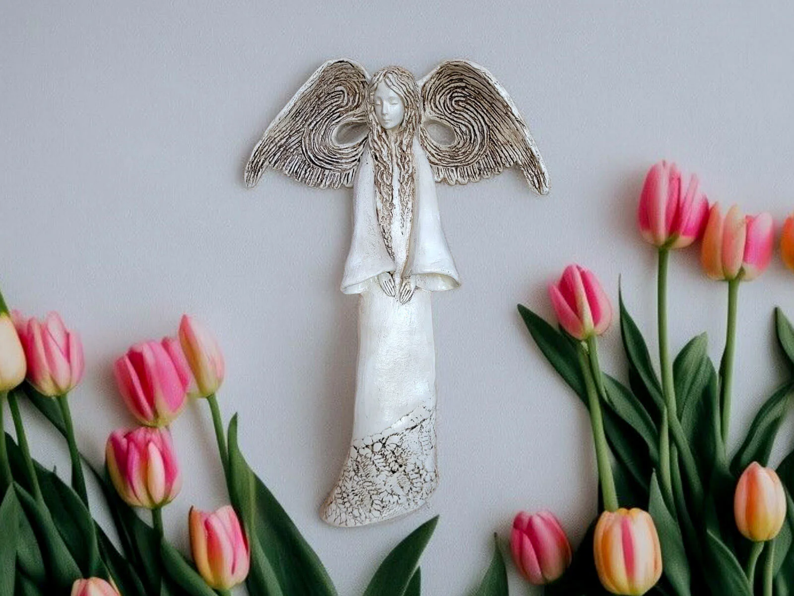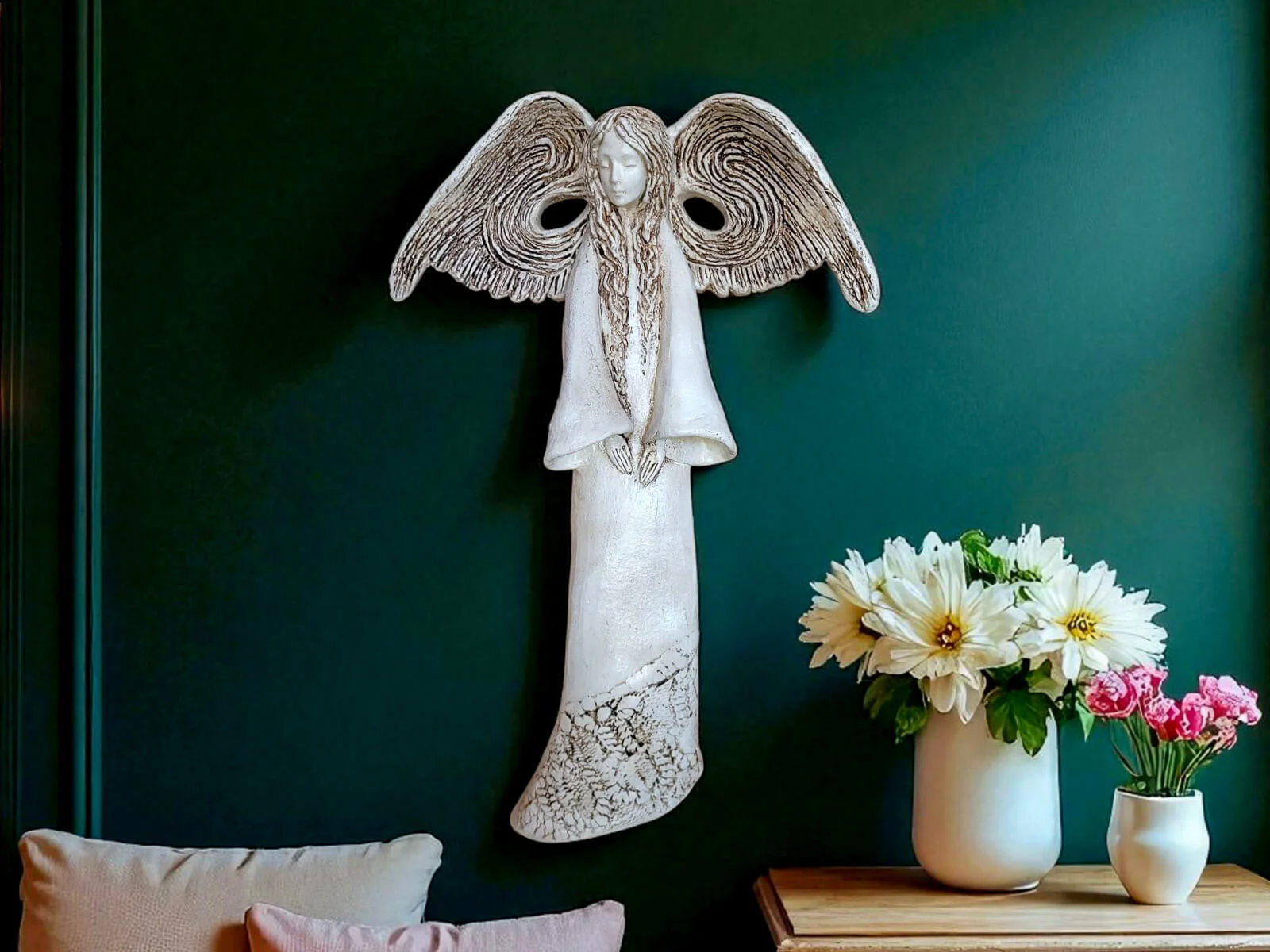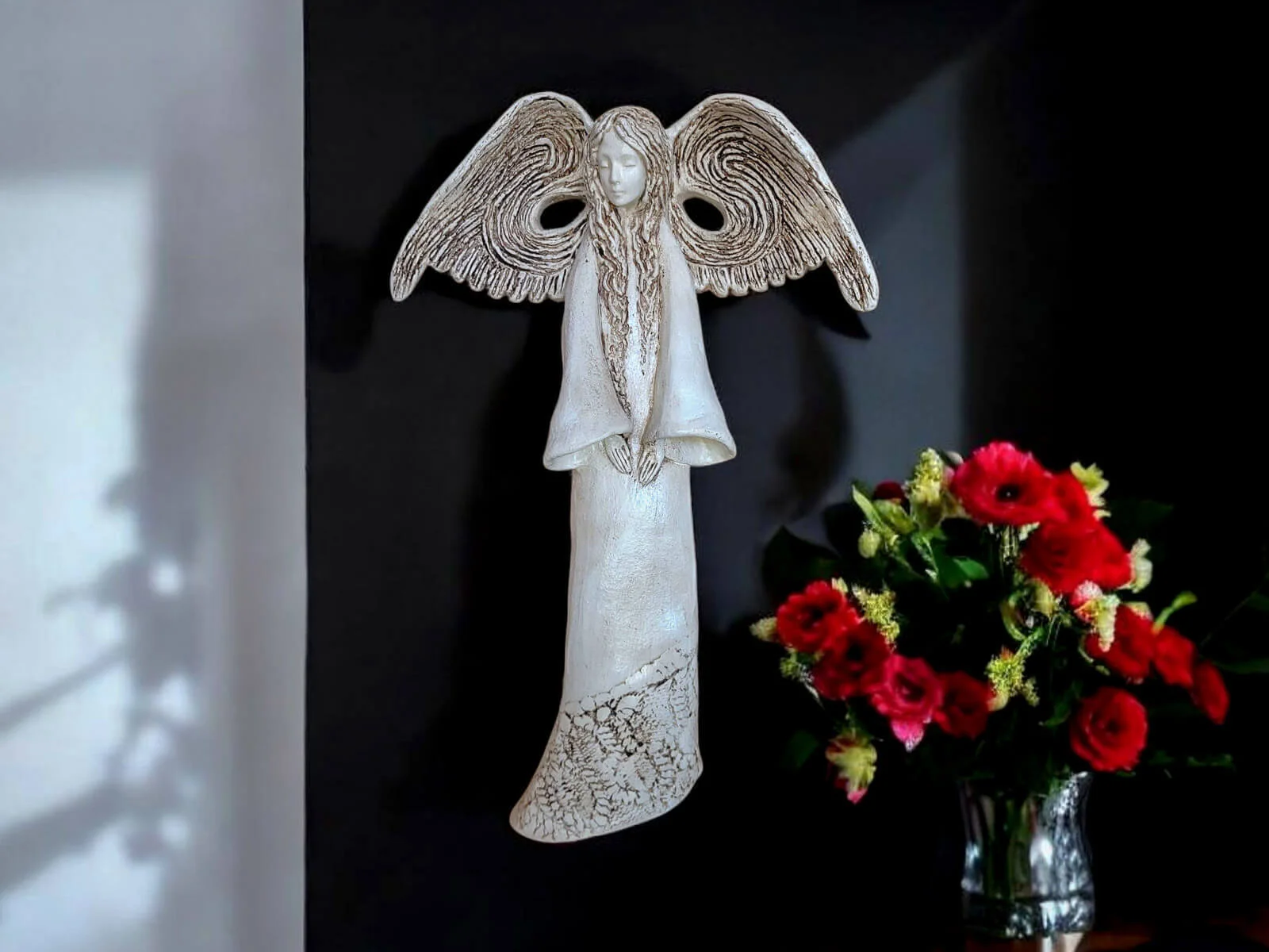 Anioł Clara to gipsowa dekoracja wykonana ręcznie. Jest nim kobieta w długiej, beżowej sukni z ozdobnymi kwiatami na dole. Ma długie, kręcone włosy oraz duże, rozłożone skrzydła z ciekawymi wycięciami na środku. Ręce są skierowane na przód sylwetki, a głowa pochylona w dół. Anioł jest figurką wiszącą, dzięki czemu można zawiesić go na ścianie w widocznym miejscu. Można go również podarować na prezent dla dziadków, rodziców lub kogoś bliskiego kto lubi piękne dekoracje.