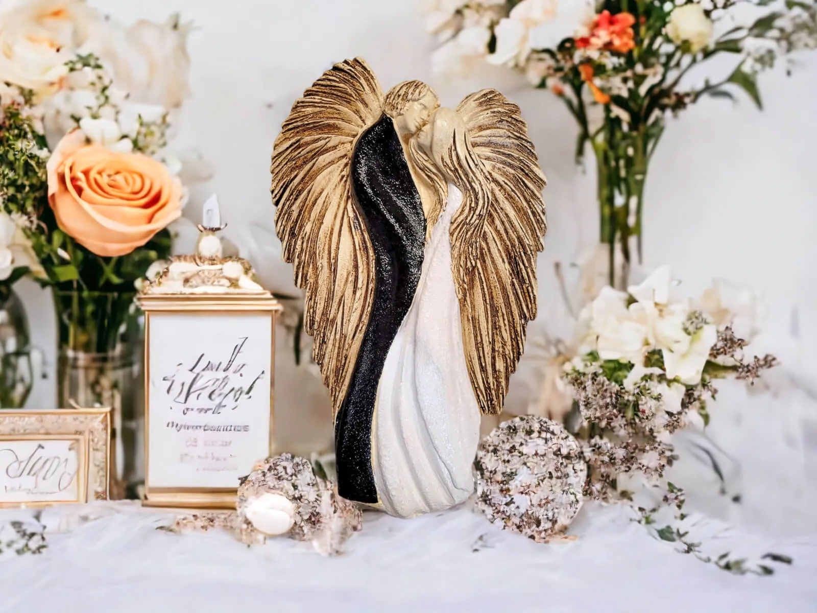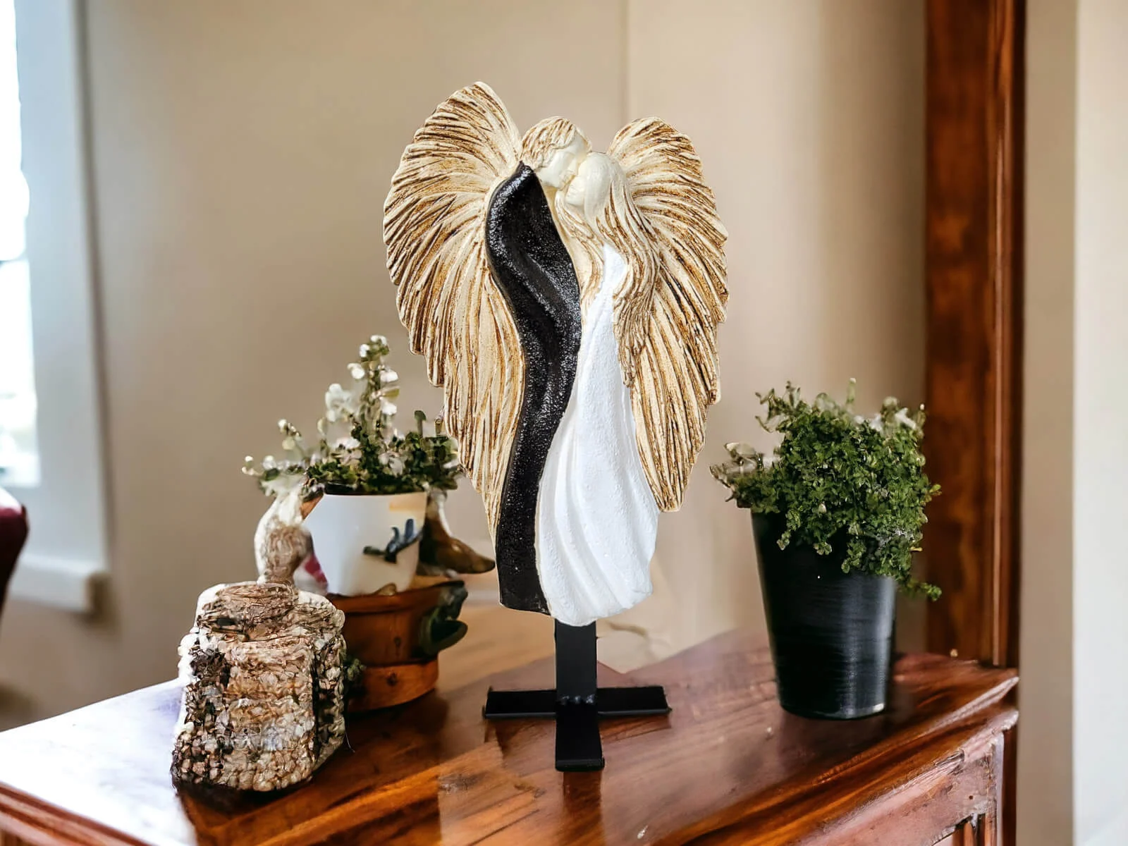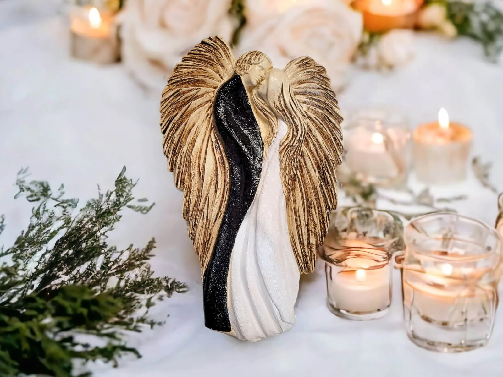 Figurka Zakochanych Aniołów Yin and Yang - Symbol Miłości w Czerni i Bieli to ręcznie robiona figurkę aniołów, która nie tylko emanuje delikatnością i pięknem, ale także przynosi ze sobą przesłanie miłości. Ta symboliczna reprezentacja yin and yang, gdzie biały anioł i czarny anioł łączą się w harmonii, stanowi idealny prezent na ślub, rocznicę ślubu lub inne wyjątkowe okazje.