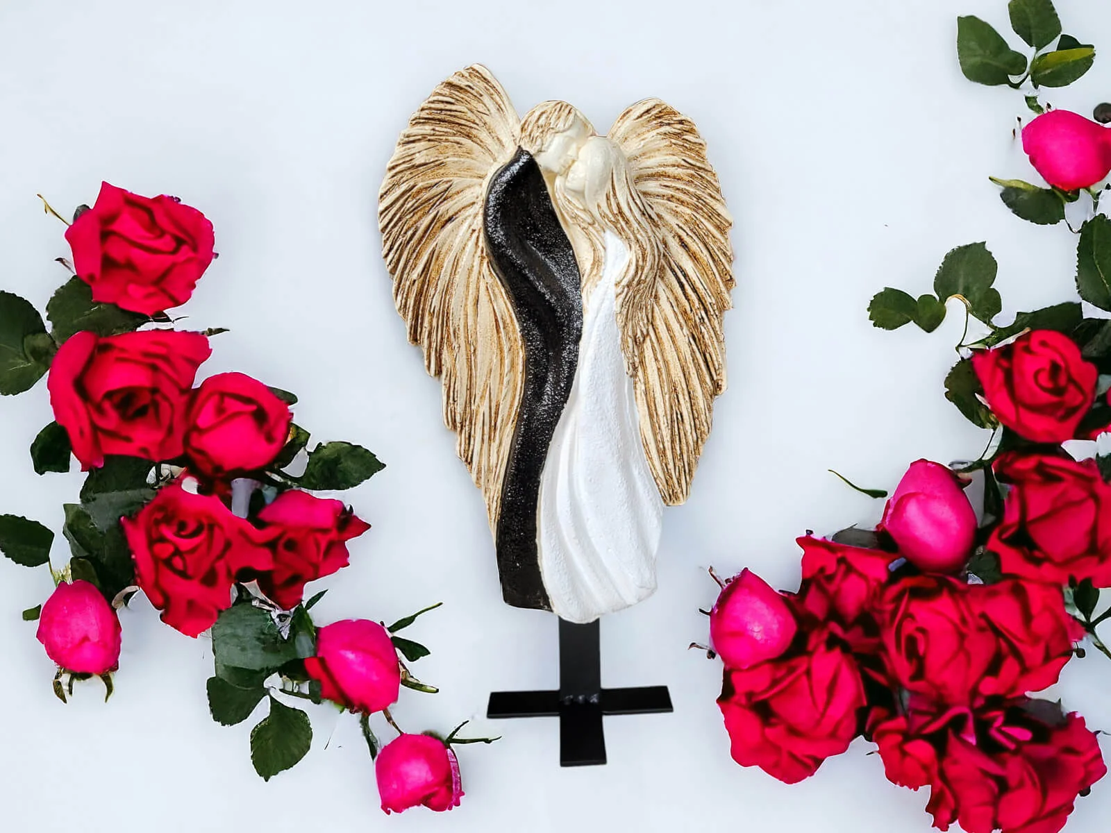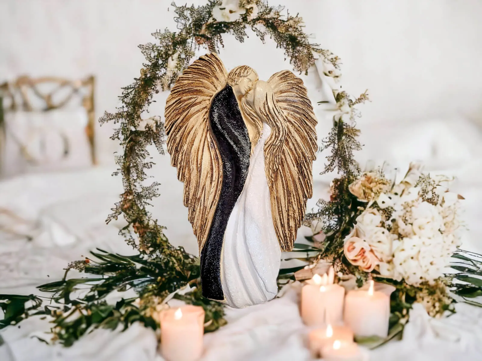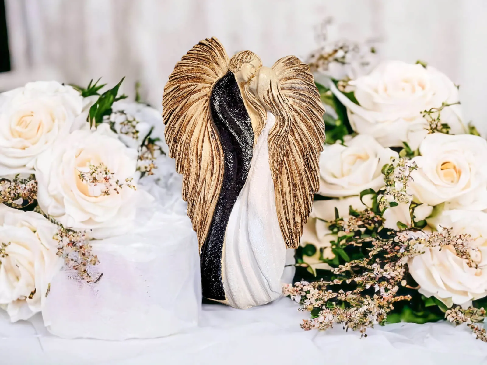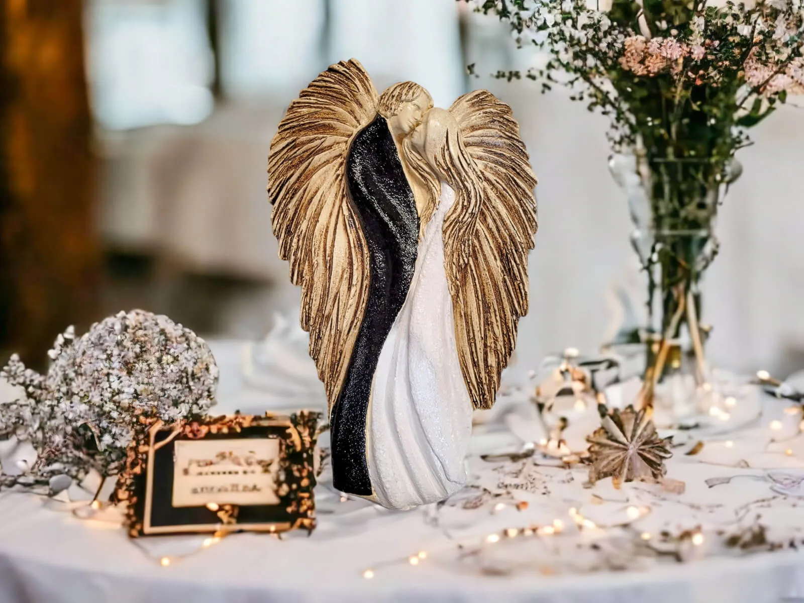 Figurka Zakochanych Aniołów Yin and Yang - Symbol Miłości w Czerni i Bieli to ręcznie robiona figurkę aniołów, która nie tylko emanuje delikatnością i pięknem, ale także przynosi ze sobą przesłanie miłości. Ta symboliczna reprezentacja yin and yang, gdzie biały anioł i czarny anioł łączą się w harmonii, stanowi idealny prezent na ślub, rocznicę ślubu lub inne wyjątkowe okazje.