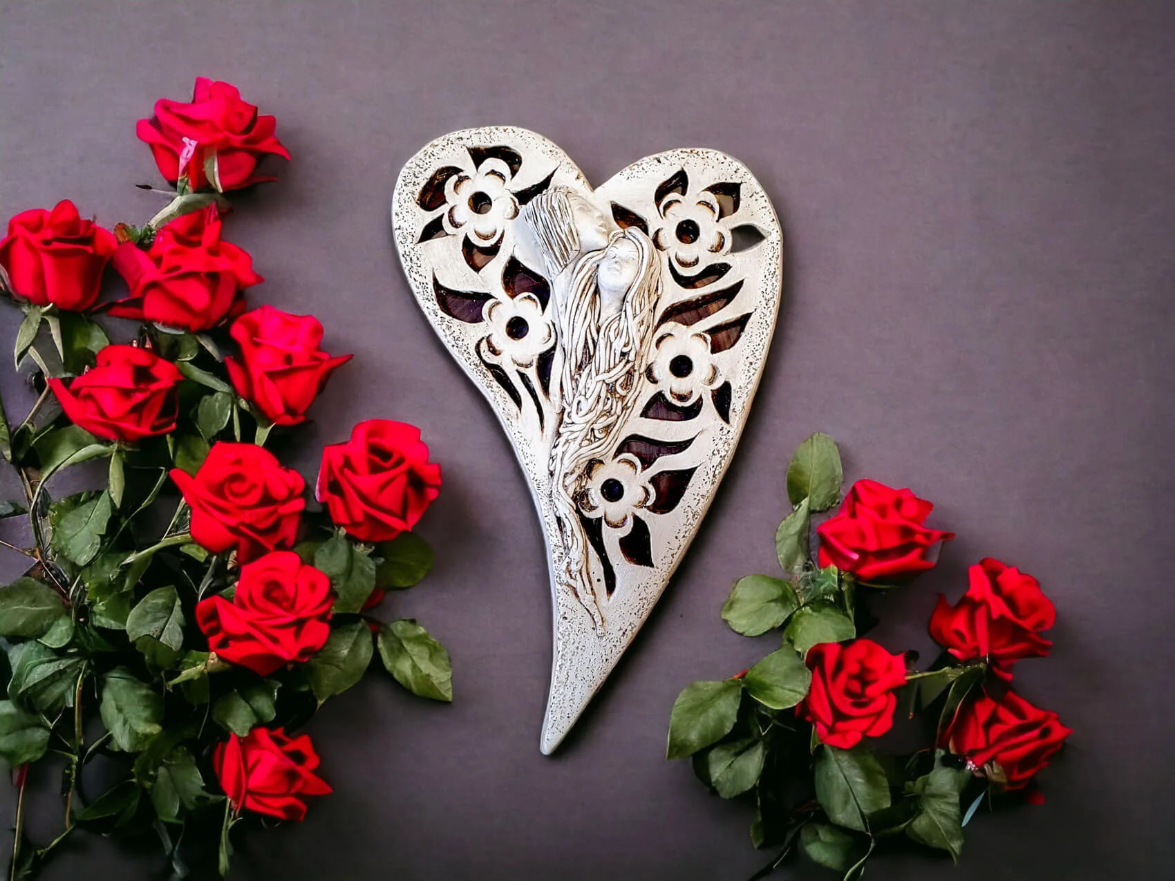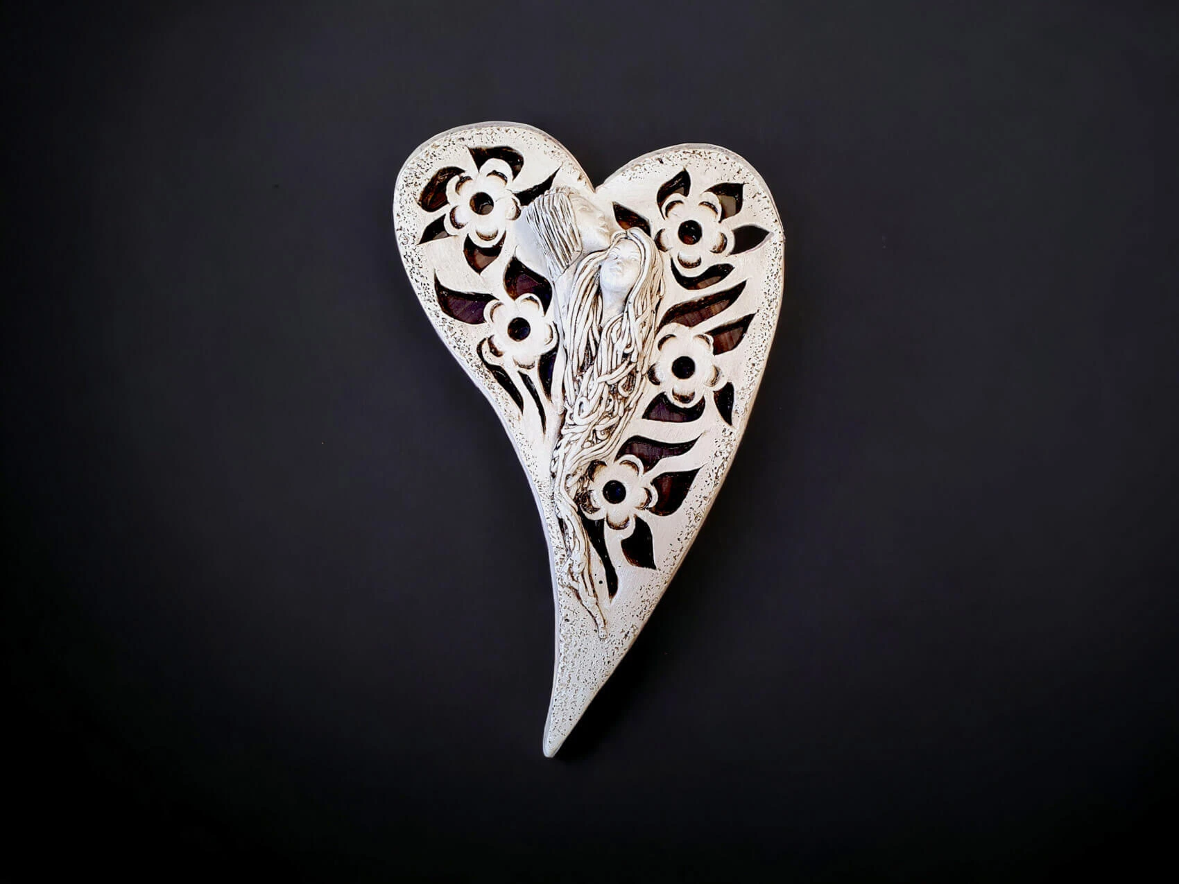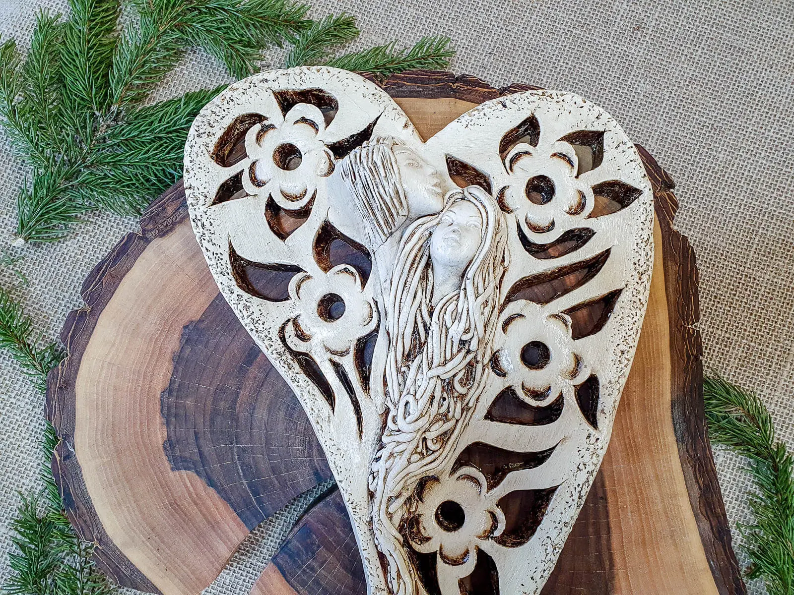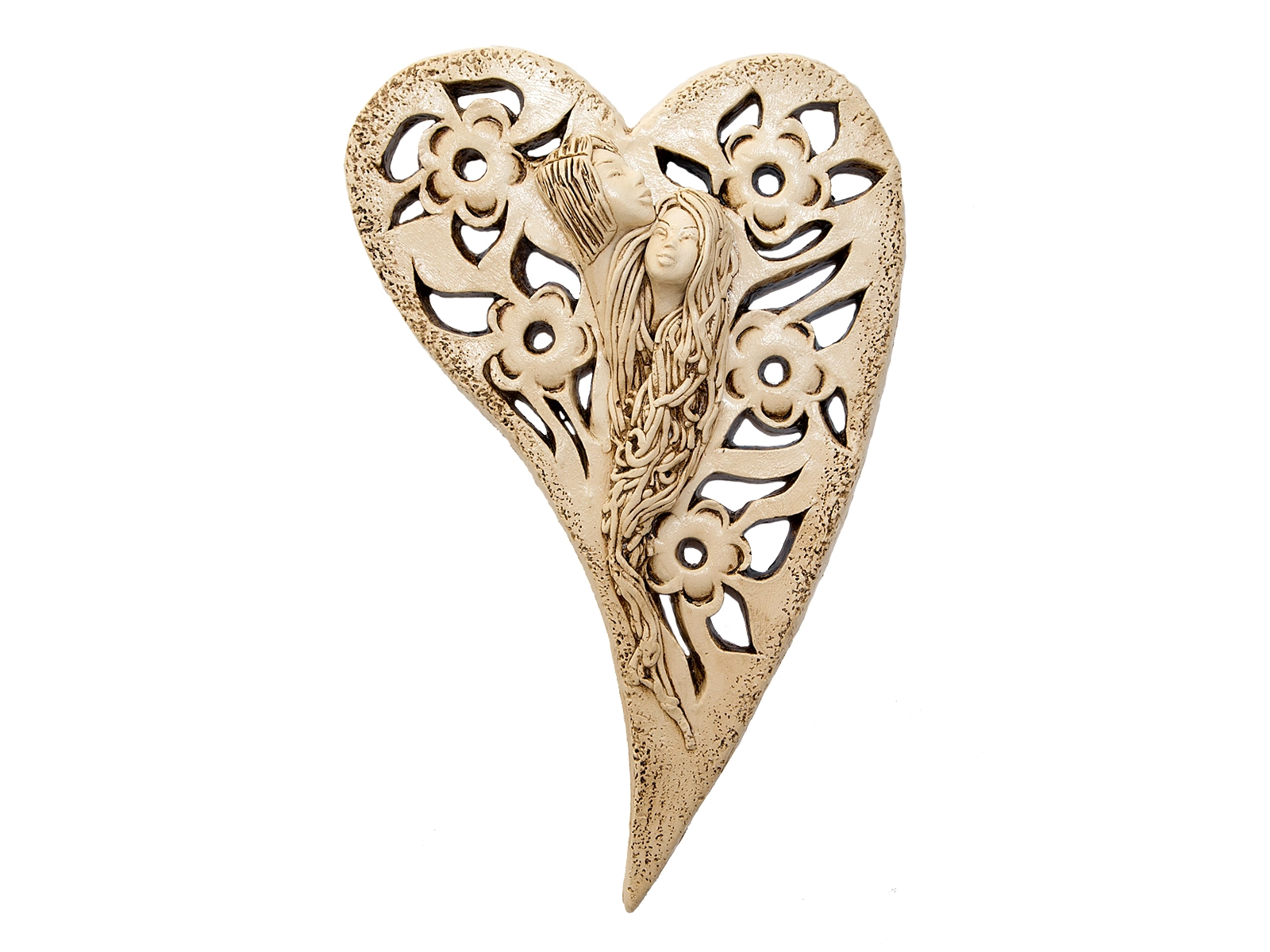 Anioły Alexis & Jay to wisząca, gipsowa dekoracja w kształcie serca. Twarze aniołów są umieszczone na środku serca, a wokół nich widnieją piękne kwiaty. Anioł Jay jest mężczyzną o krótkich włosach, który podpiera swoją brodę na głowie Alexis. Kobieta ma długie, jasne włosy, którymi mogłaby być cała okryta. Między postaciami widać uczucie miłości, które ich łączy. Figurka pięknie eksponowałaby się na ścianie w widocznym miejscu, gdzie przyciągałaby wszystkich uwagę. Mogłaby być ofiarowana w prezencie dla Pary Młodej lub dla bliskiej osoby, którą darzy się miłością.