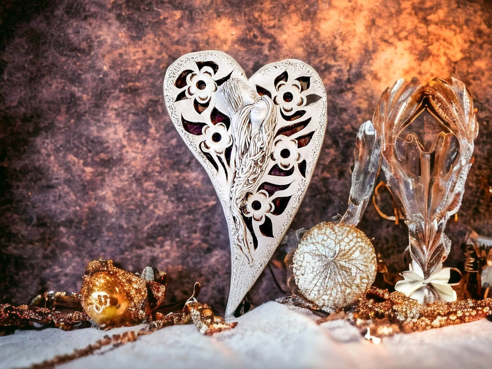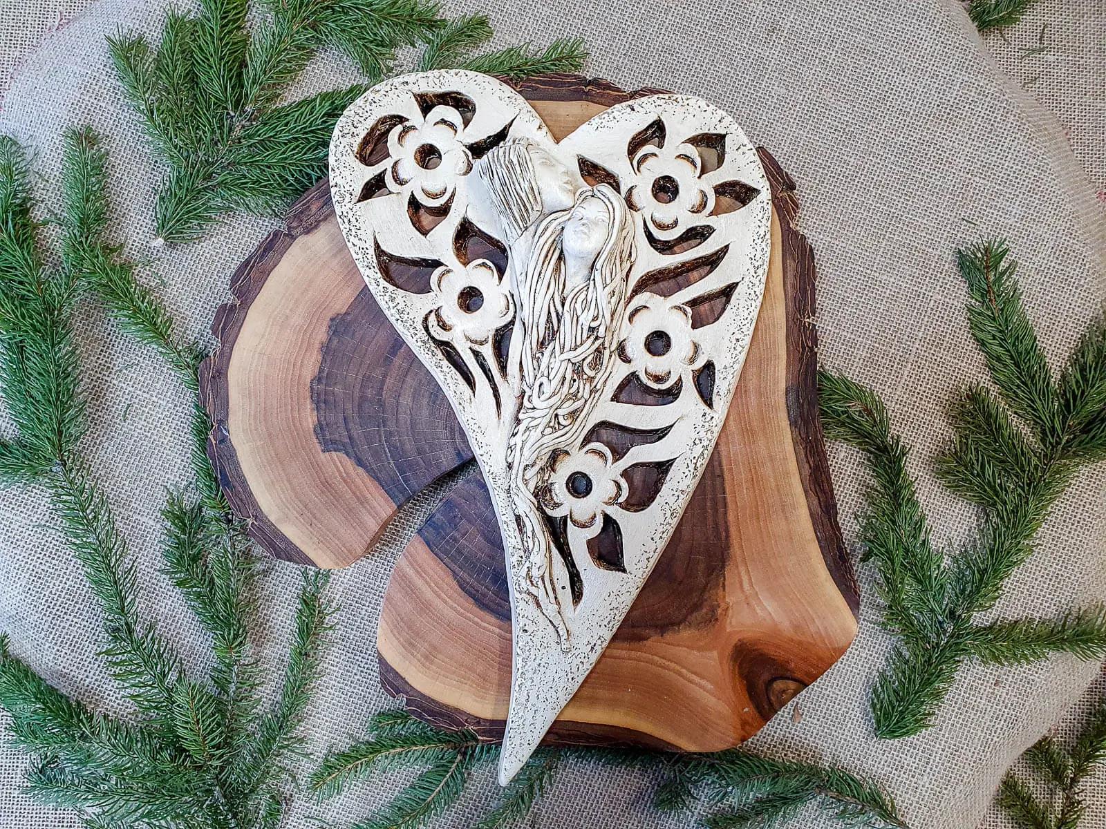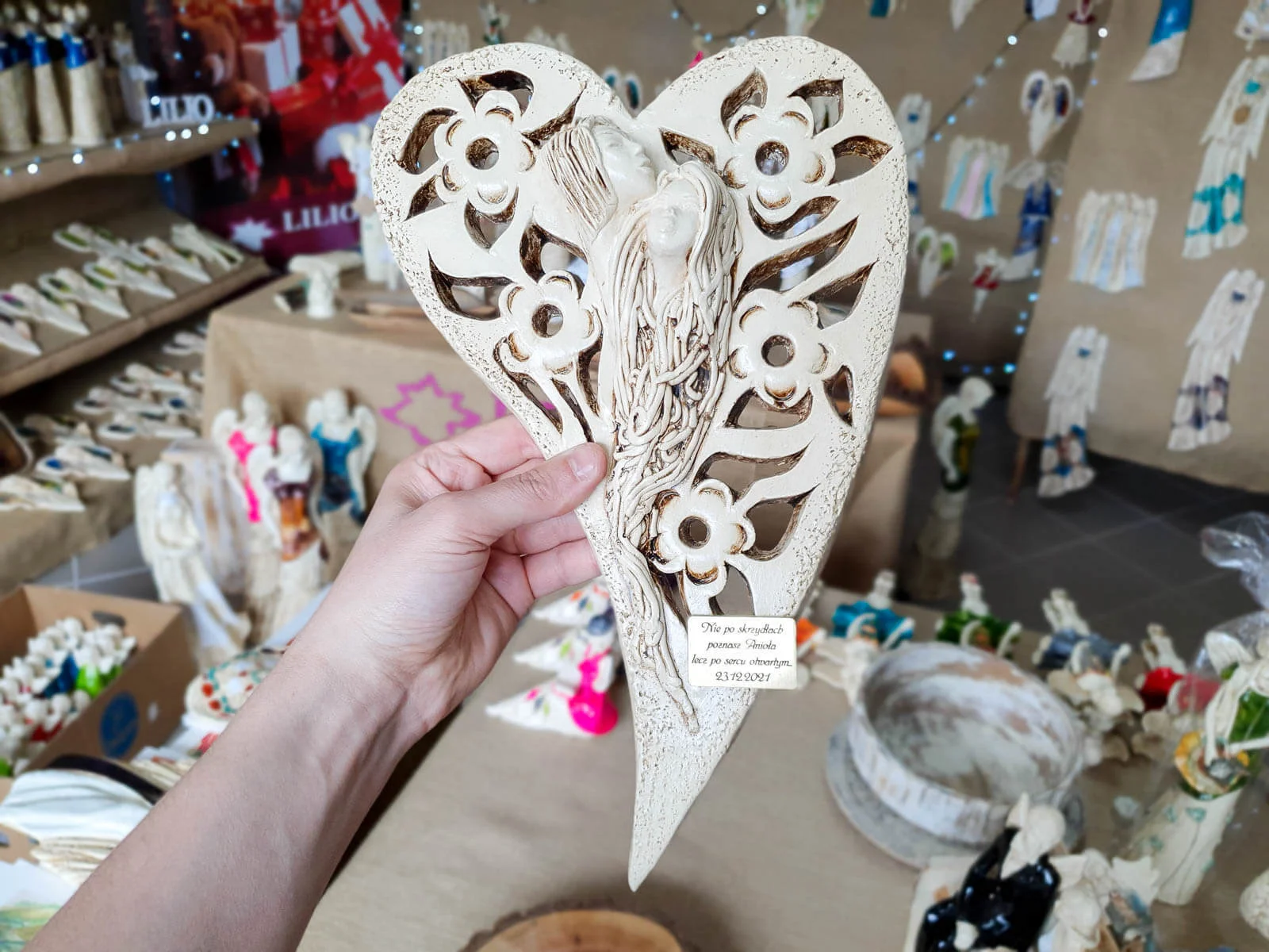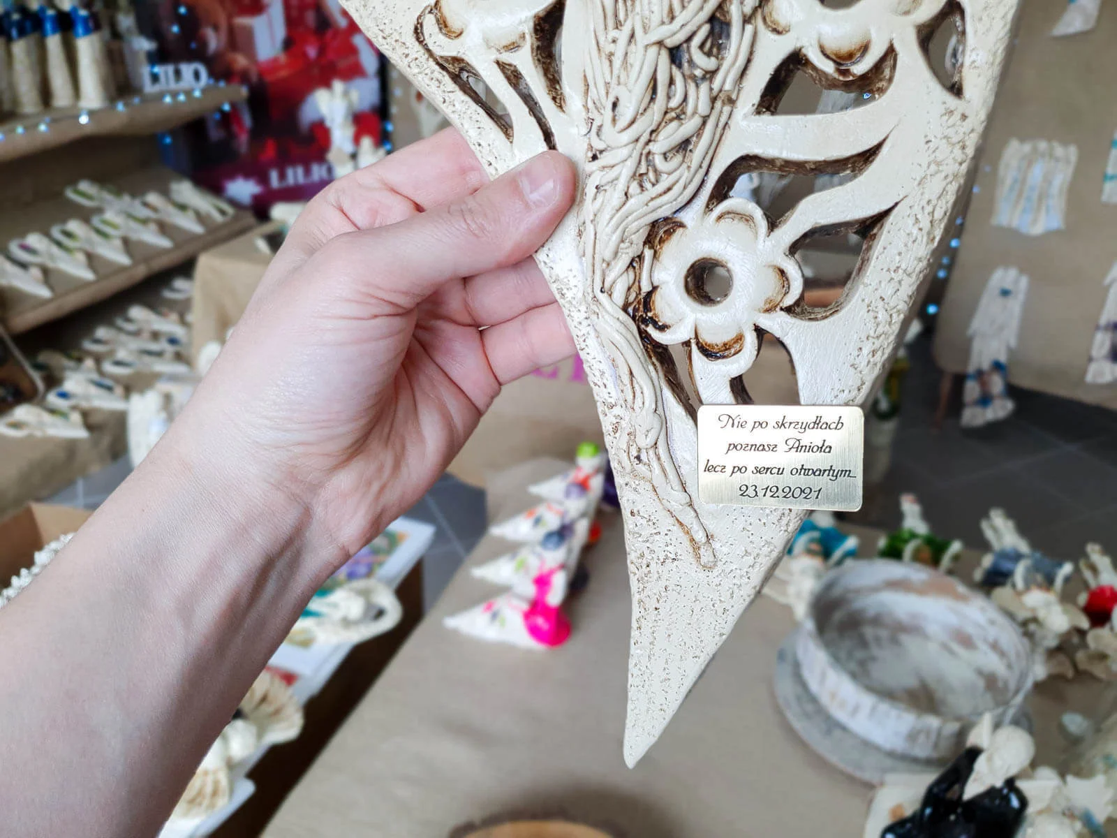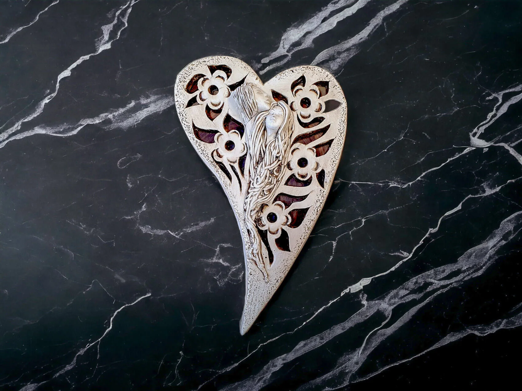 Anioły Alexis & Jay to wisząca, gipsowa dekoracja w kształcie serca. Twarze aniołów są umieszczone na środku serca, a wokół nich widnieją piękne kwiaty. Anioł Jay jest mężczyzną o krótkich włosach, który podpiera swoją brodę na głowie Alexis. Kobieta ma długie, jasne włosy, którymi mogłaby być cała okryta. Między postaciami widać uczucie miłości, które ich łączy. Figurka pięknie eksponowałaby się na ścianie w widocznym miejscu, gdzie przyciągałaby wszystkich uwagę. Mogłaby być ofiarowana w prezencie dla Pary Młodej lub dla bliskiej osoby, którą darzy się miłością.