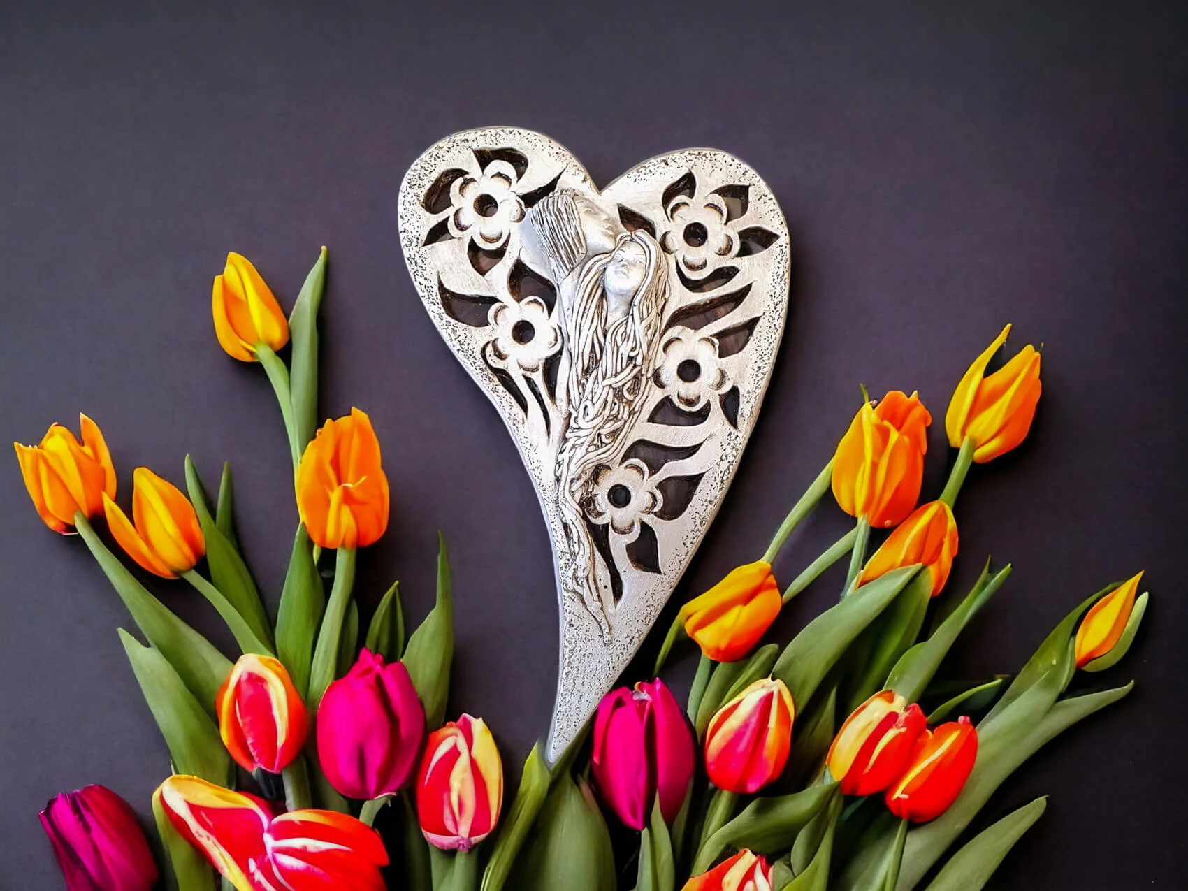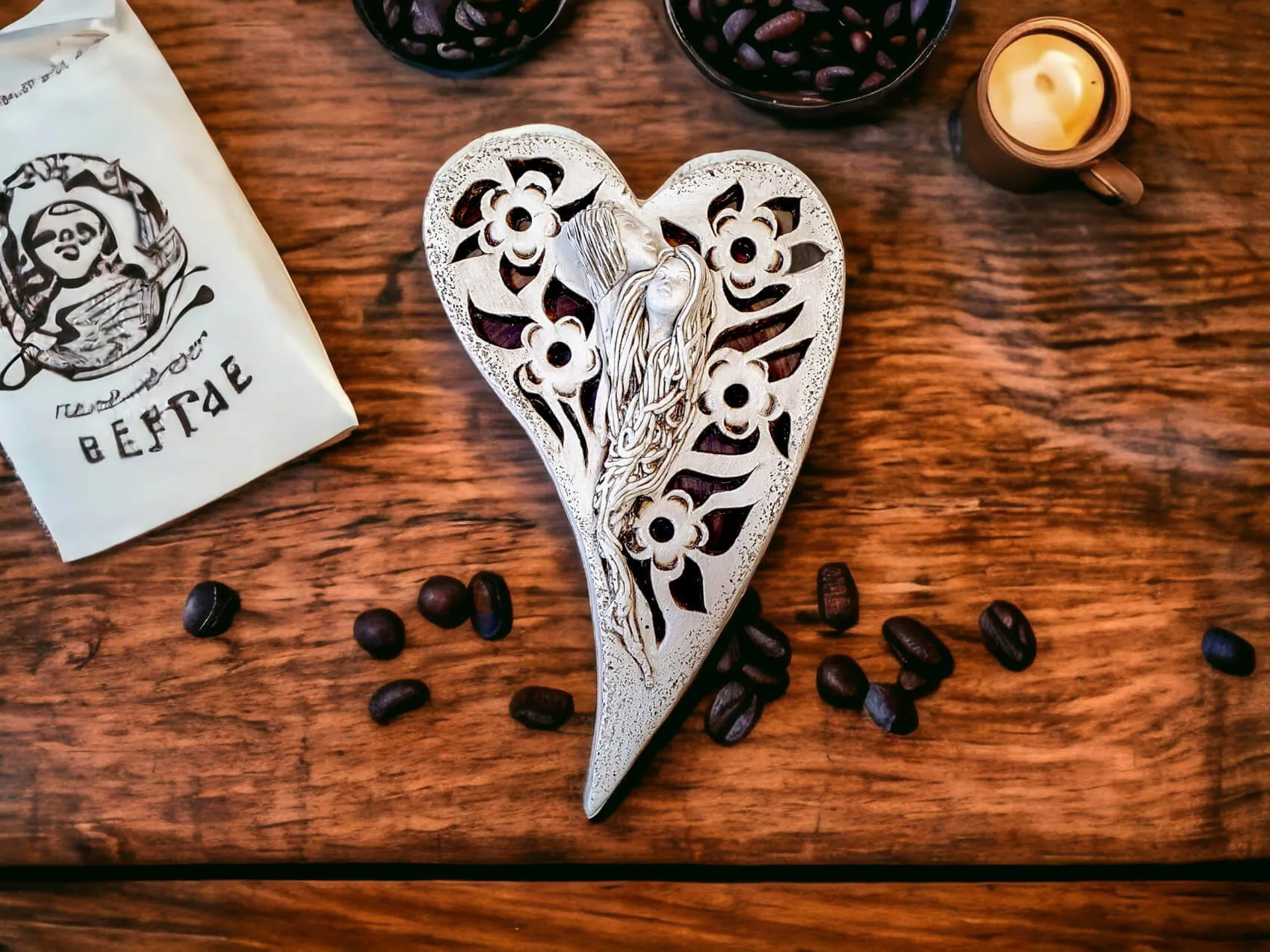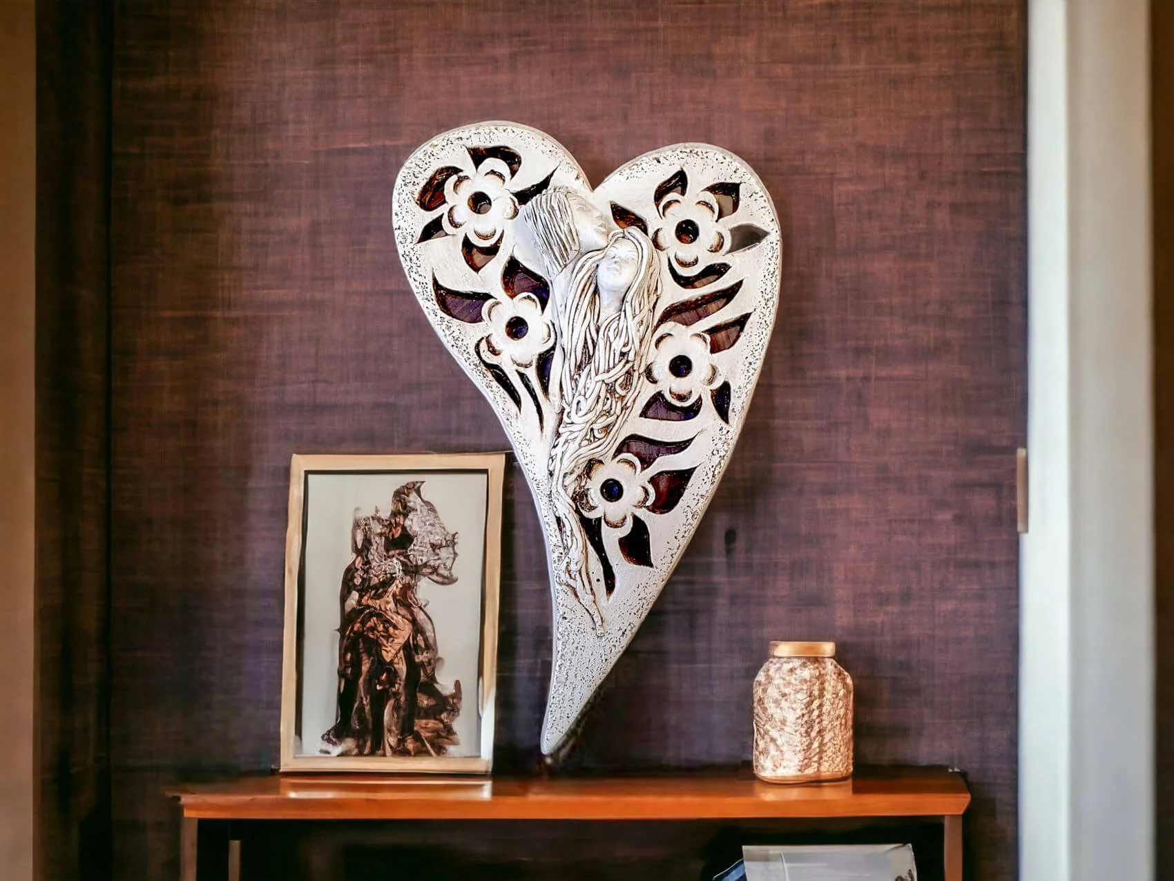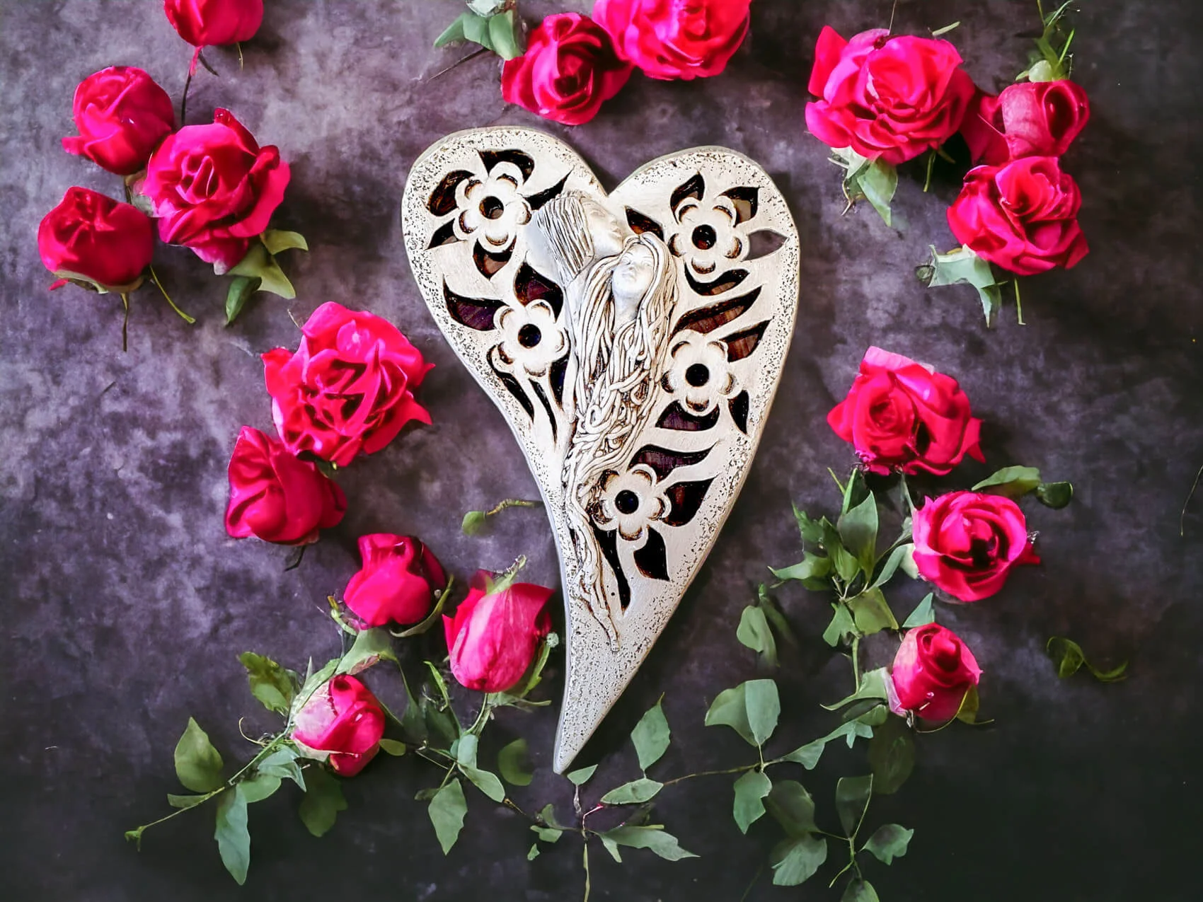 Anioły Alexis & Jay to wisząca, gipsowa dekoracja w kształcie serca. Twarze aniołów są umieszczone na środku serca, a wokół nich widnieją piękne kwiaty. Anioł Jay jest mężczyzną o krótkich włosach, który podpiera swoją brodę na głowie Alexis. Kobieta ma długie, jasne włosy, którymi mogłaby być cała okryta. Między postaciami widać uczucie miłości, które ich łączy. Figurka pięknie eksponowałaby się na ścianie w widocznym miejscu, gdzie przyciągałaby wszystkich uwagę. Mogłaby być ofiarowana w prezencie dla Pary Młodej lub dla bliskiej osoby, którą darzy się miłością.