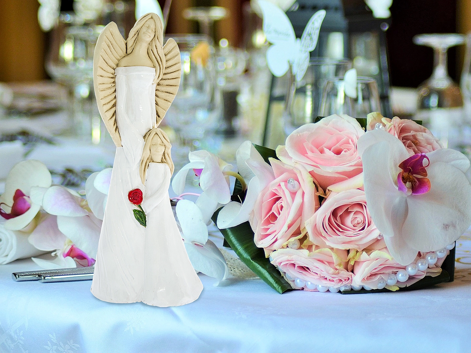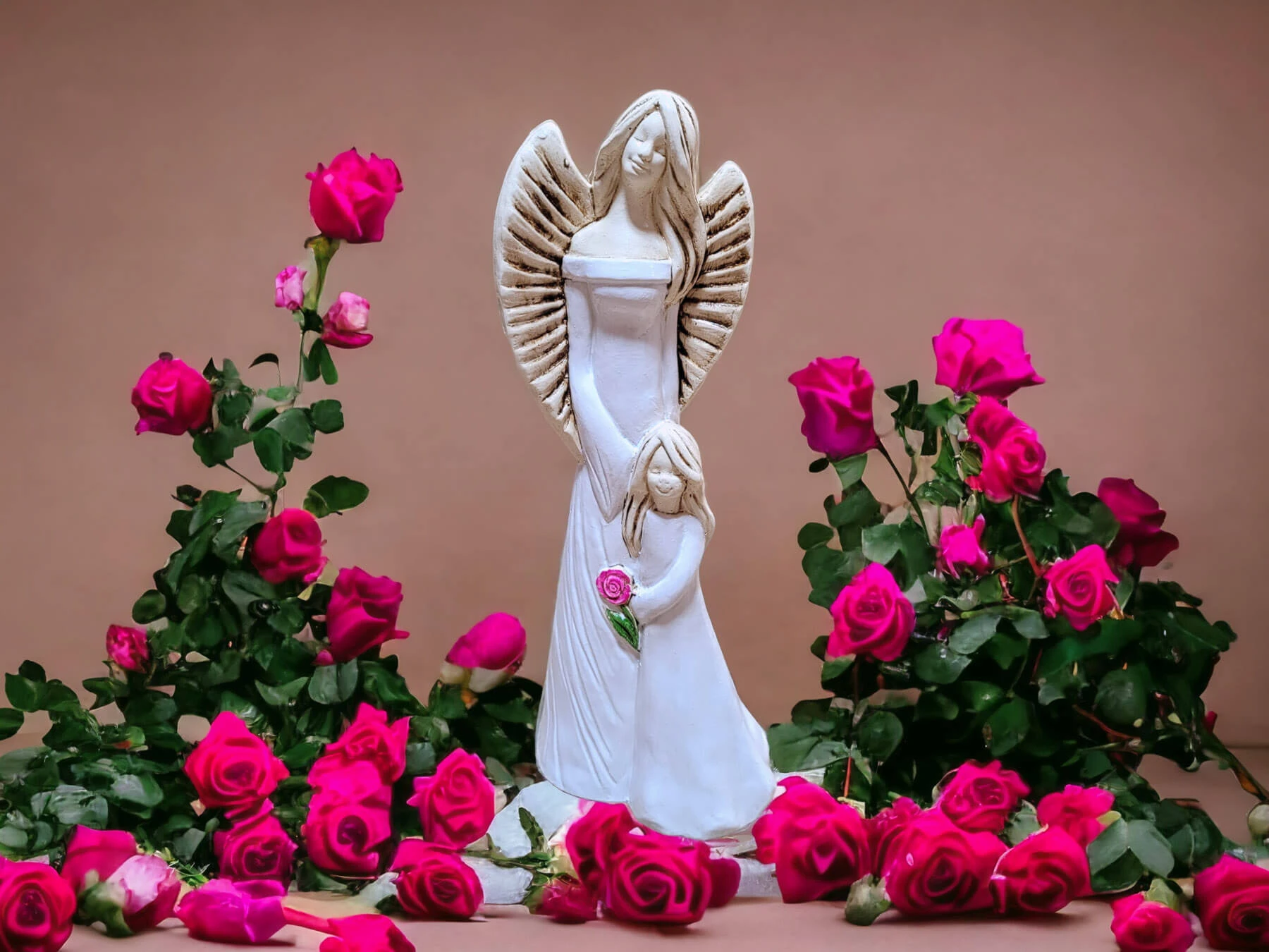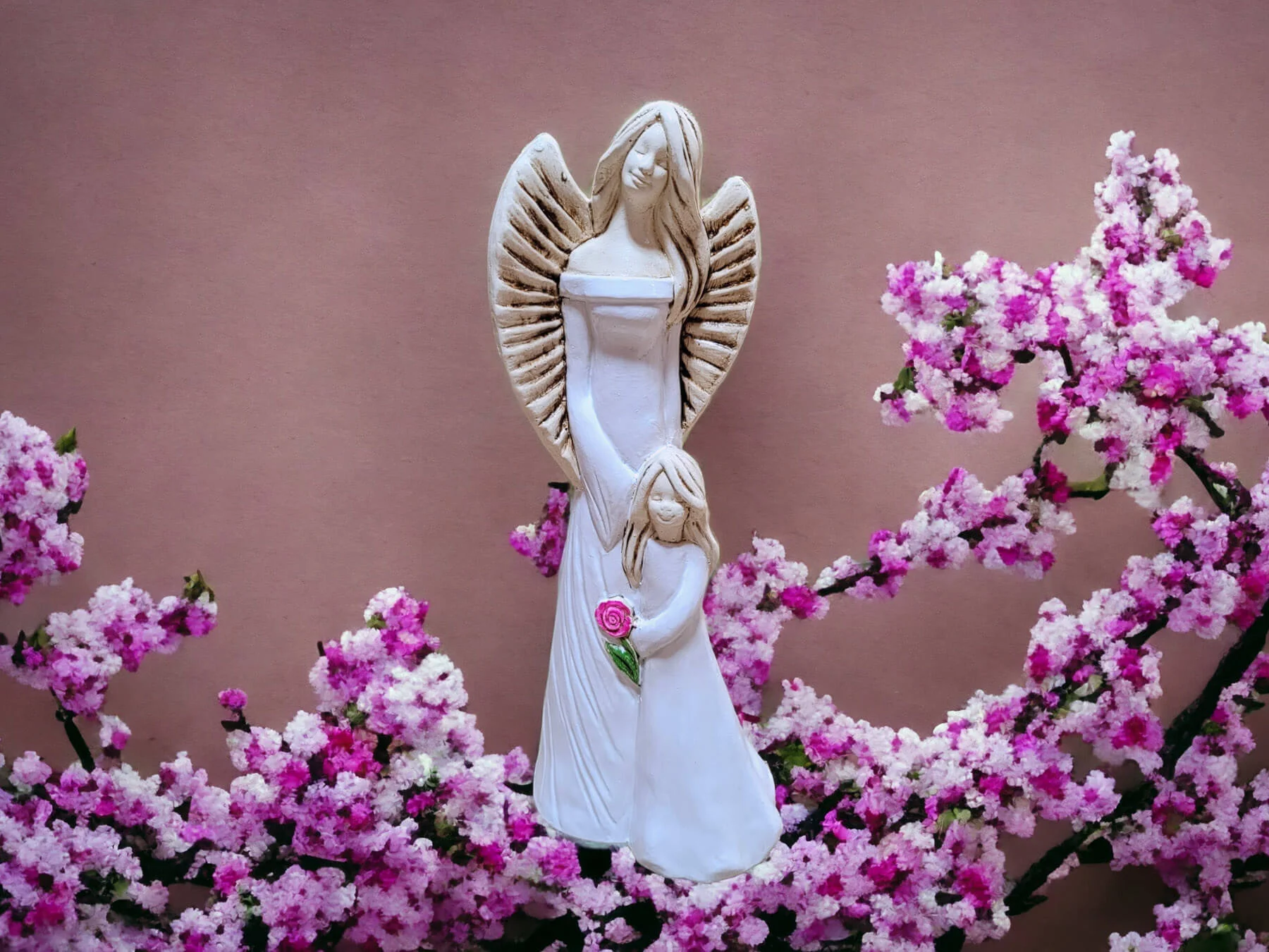 Ręcznie robione anioły Hannah i Evelyn w śnieżnych białych sukniach z kwiatem. Figurka wykonana jest ręcznie z gipsu i przedstawia postać kobiety o spokojnym wyrazie twarzy trzymającej w objęciach dziewczynkę. Anioły mają piękne kolory - całość utrzymana jest w delikatnych tonacjach bieli i beżu. Cechą wyróżniającą tę figurkę od innych jest trzymany przez dziecko kwiat róży - przepiękny akcent w intensywnych barwach. Idealny prezent na pamiątkę pierwszej komunii świętej, chrztu, urodziny.