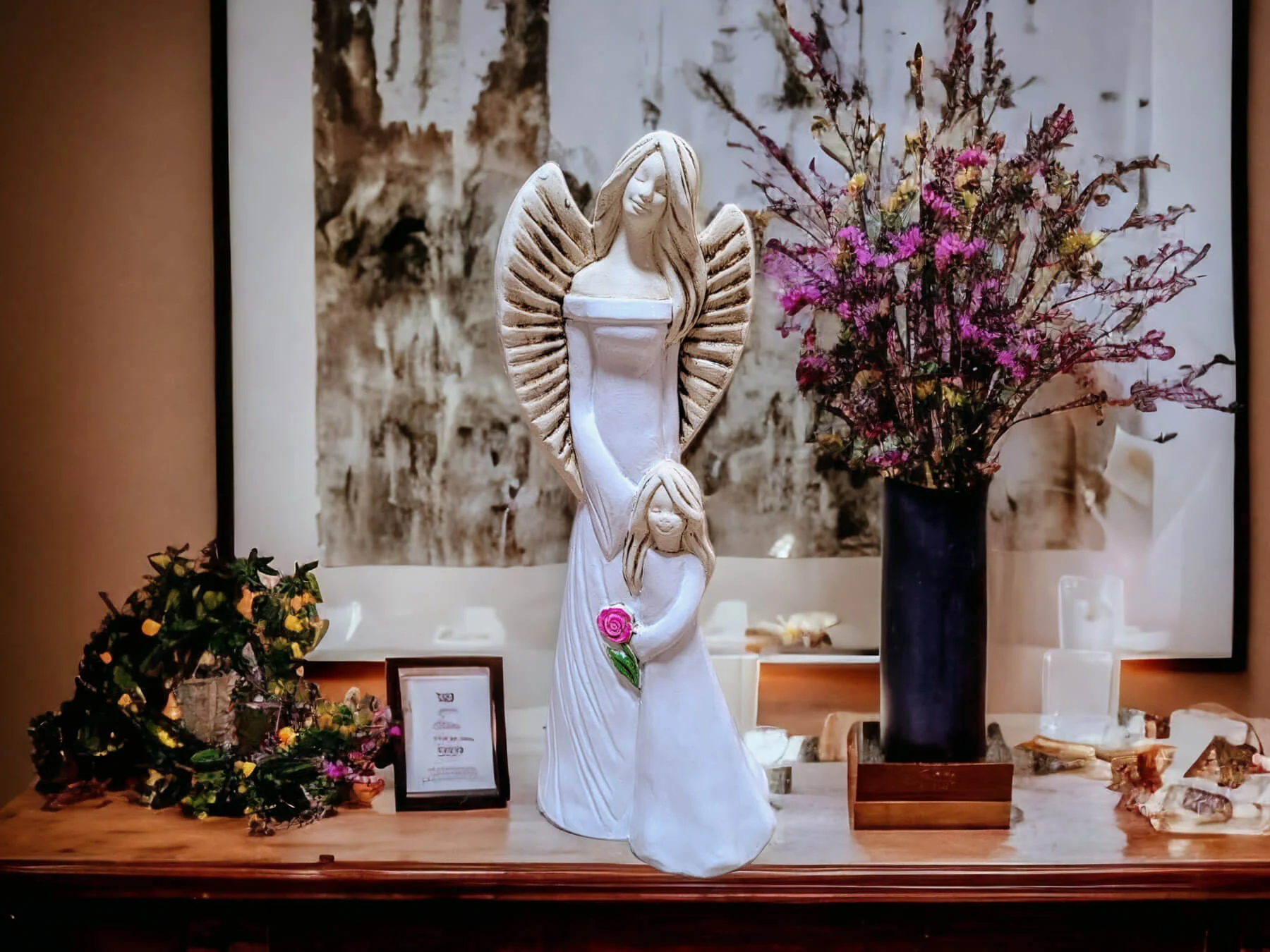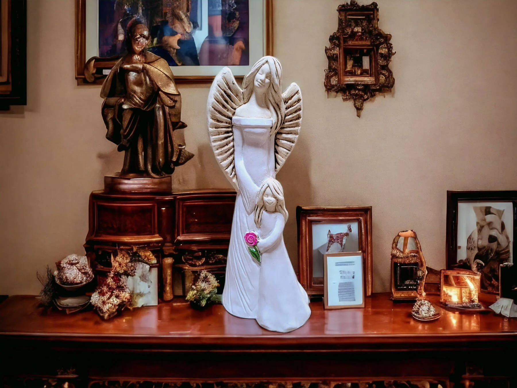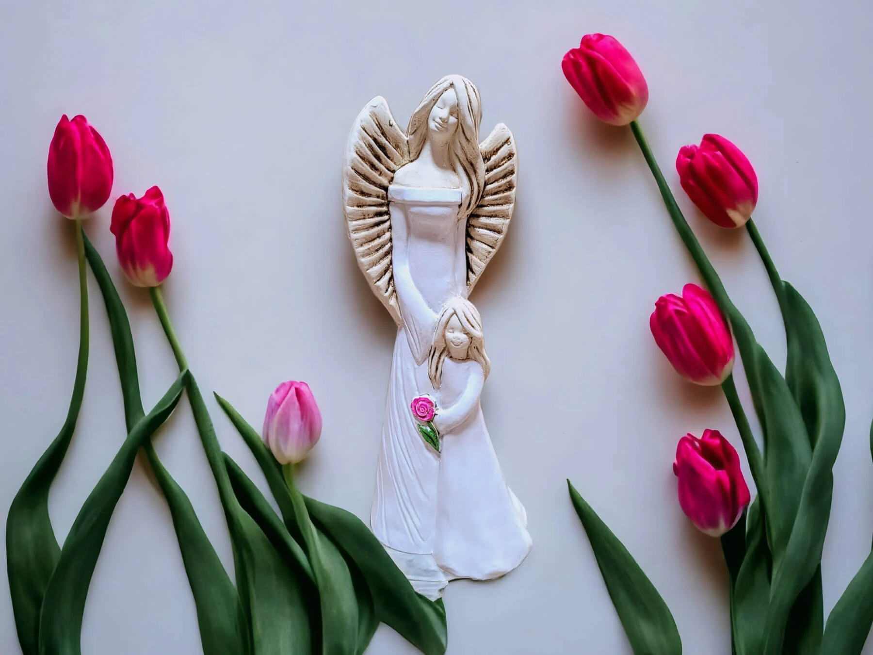 Ręcznie robione anioły Hannah i Evelyn w śnieżnych białych sukniach z kwiatem. Figurka wykonana jest ręcznie z gipsu i przedstawia postać kobiety o spokojnym wyrazie twarzy trzymającej w objęciach dziewczynkę. Anioły mają piękne kolory - całość utrzymana jest w delikatnych tonacjach bieli i beżu. Cechą wyróżniającą tę figurkę od innych jest trzymany przez dziecko kwiat róży - przepiękny akcent w intensywnych barwach. Idealny prezent na pamiątkę pierwszej komunii świętej, chrztu, urodziny.