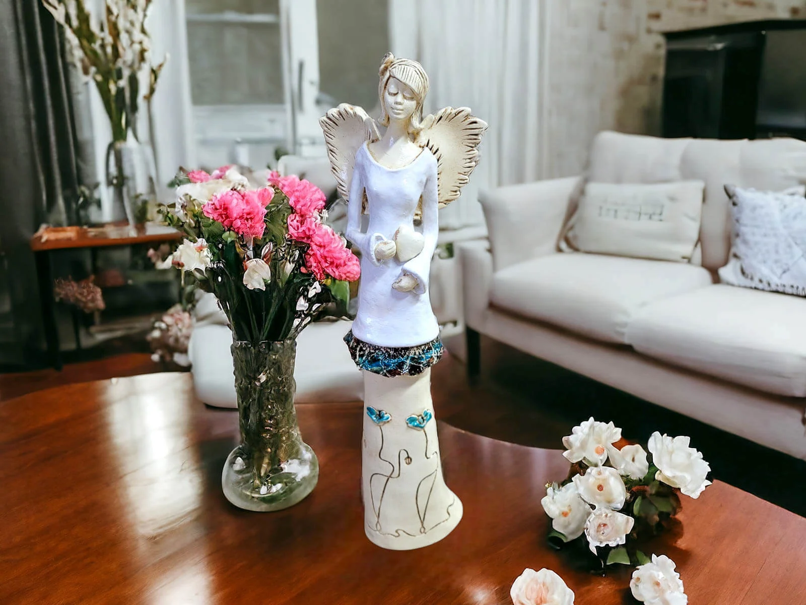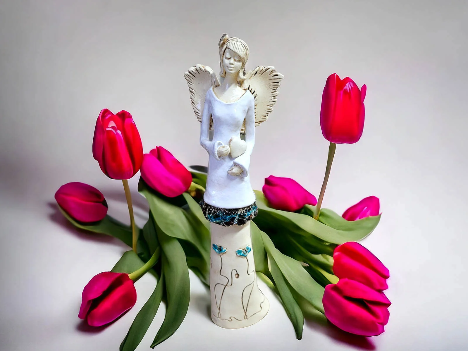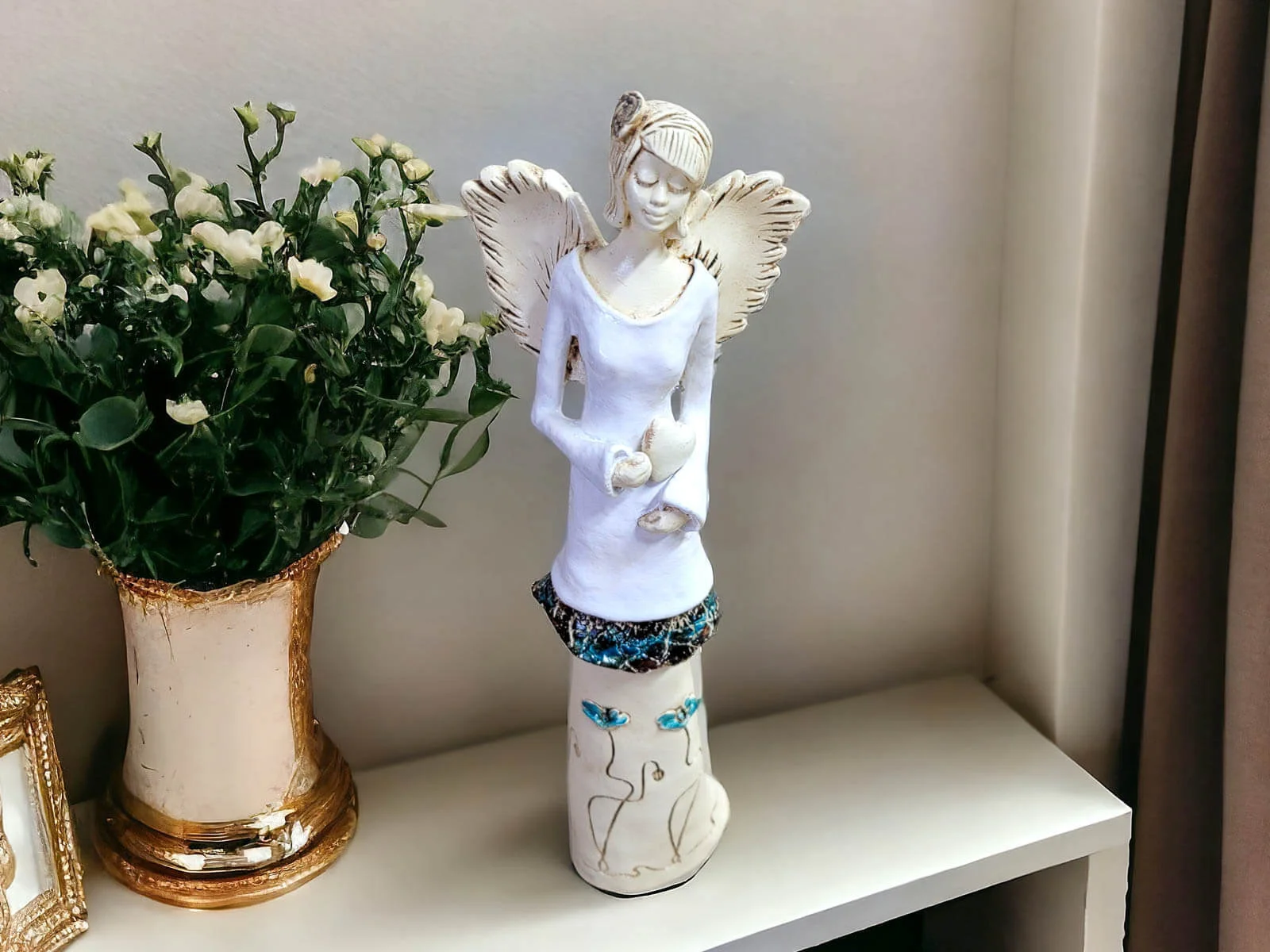 Anioł Mia jest przepiękną postacią o uspokajającym i kojącym wyrazie twarzy. Jej puszyste skrzydła dopełniają jej idylliczny charakter. Ma na sobie długą biało-beżową suknię, po której pną się kwiaty. Kwiaty, które są wszechobecne w tej figurze - znajdują się również we włosach Mii oraz w formie bukietu trzymanego w rękach. Figurka jest bardzo uniwersalna. Sprawdzi się bowiem jako prezent z wielu okazji, a przy tym będzie pięknym akcentem w każdym mieszkaniu.