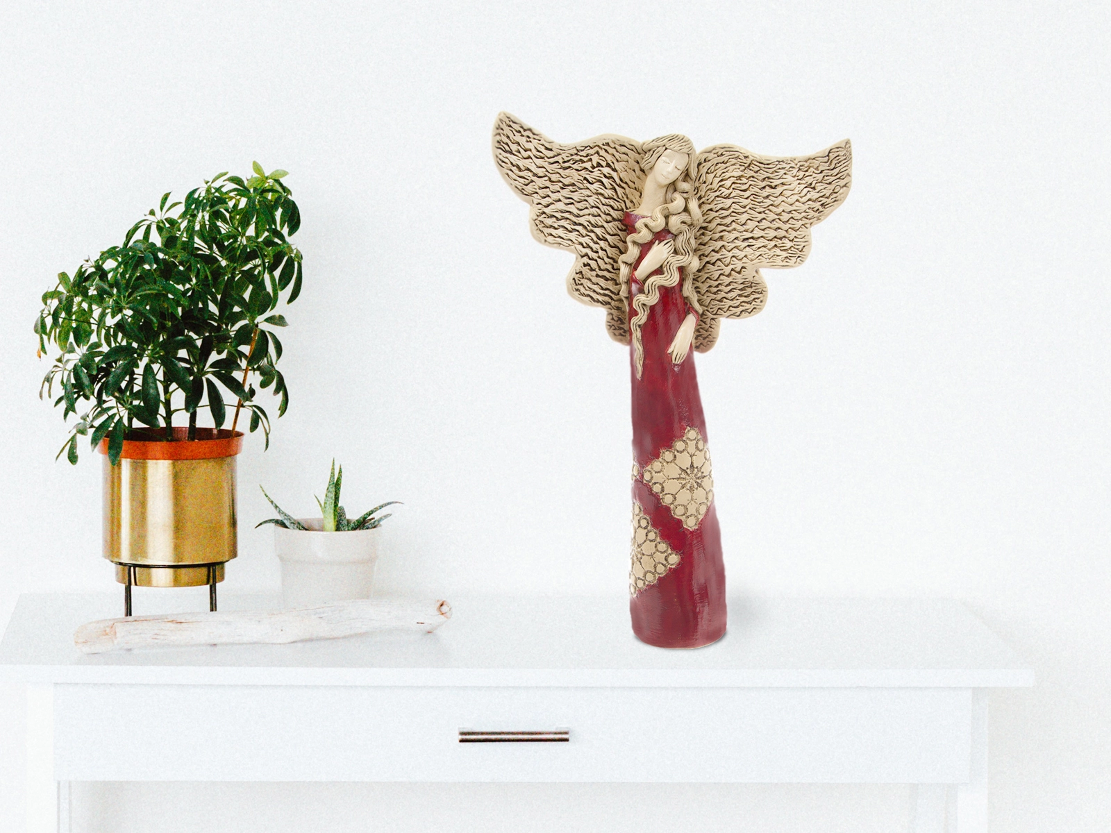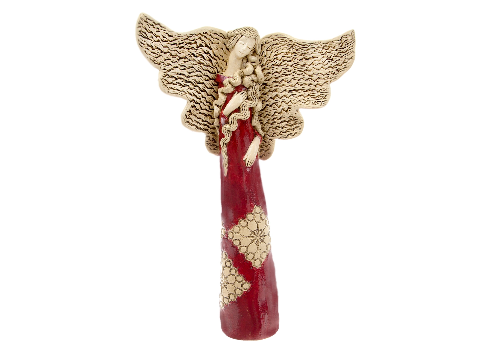 Anioł Dorothy jest kobietą, z długimi kręconymi włosami, ubrana w piękną, czerwoną suknię. Suknia na dole posiada beżowe ozdoby w kształcie udekorowanych kwadratów. Na plecach ma duże, rozłożone skrzydła, a jej głowa pochylona jest w lewą stronę. Prawa dłoń spoczywa na lewej piersi, a druga dłoń położona jest wzdłuż sylwetki. Figurka jest wykonana z gipsu ręcznej produkcji. Należy do rodzaju stojącego, dzięki czemu nadaje się na ozdobę wnętrza jak i ogrodu. Może służyć również jako prezent dla bliskiej osoby.