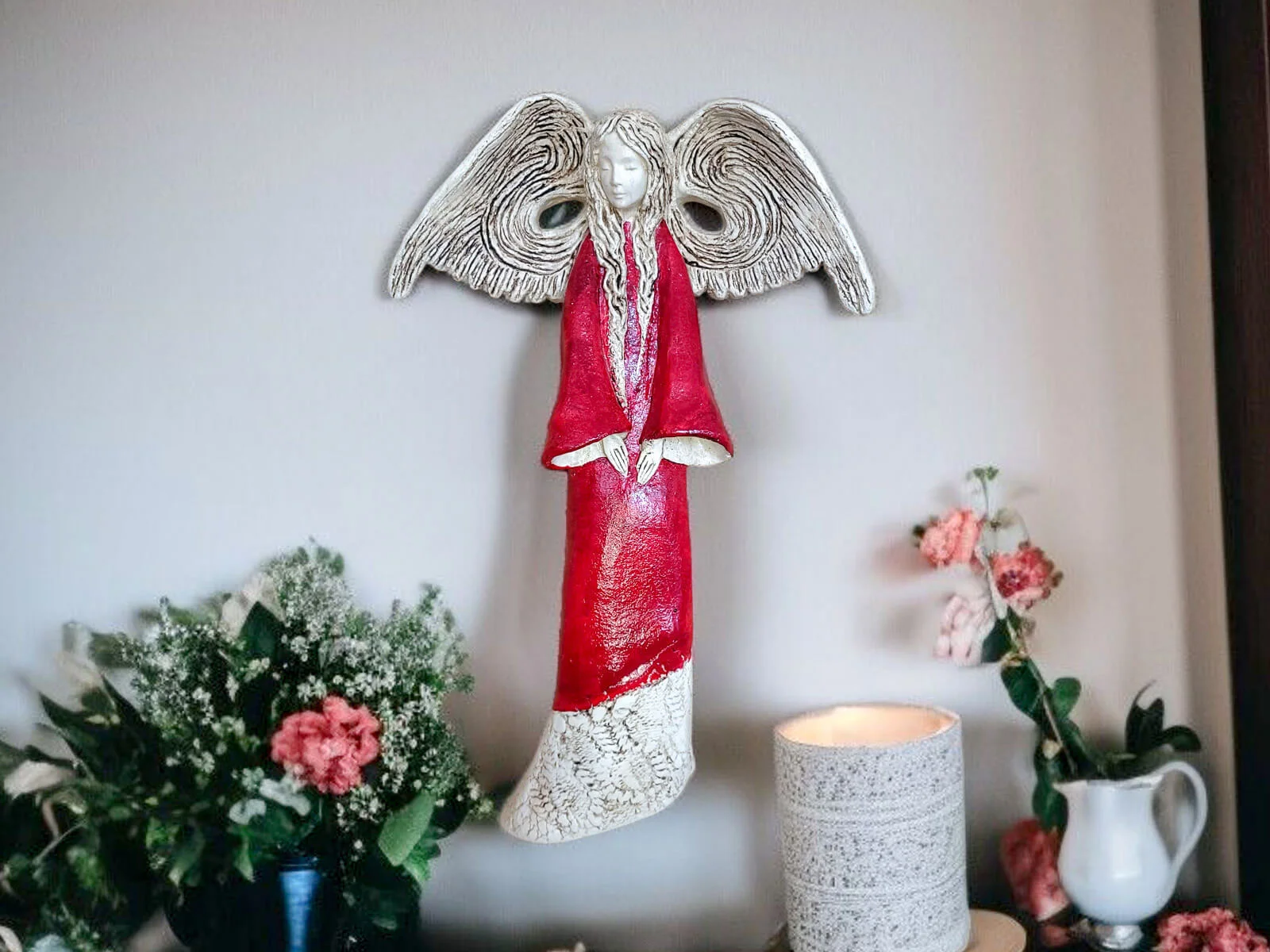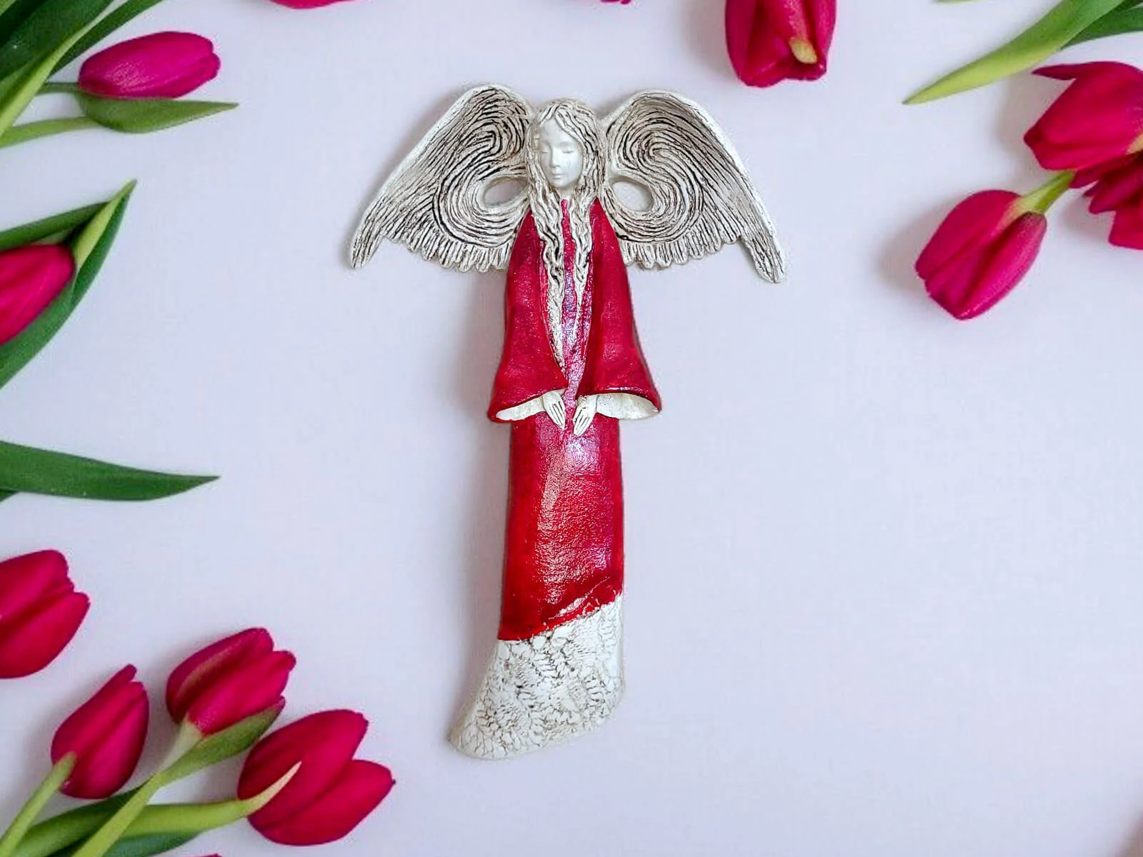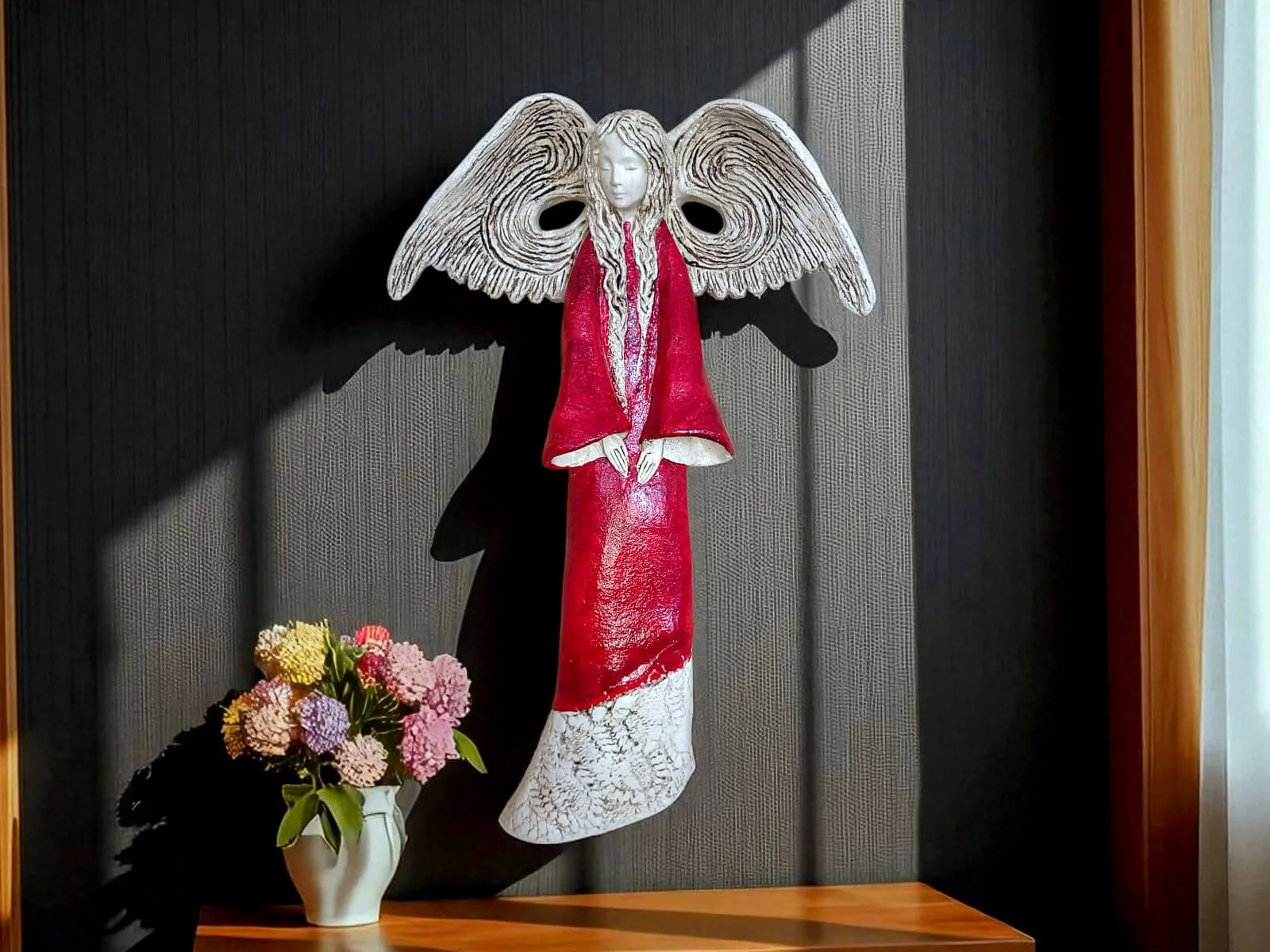 Anioł Clara to ręcznie wykonana figurka do powieszenia na ścianie. Jej imię wywodzi się od łacińskiego słowa clarus co oznacza jasny. Clara to delikatna dziewczyna o czystym sercu. Ma potężny urok osobisty, oryginalną i barwną duszę. Ubrana jest w czerwoną, długą suknię z haftowaną falbaną. Pięknie eksponuje, duże, rozłożyste skrzydła. Idealnie nadaje się na prezent na każdą okazję. Bez okazji również się nadaje :)