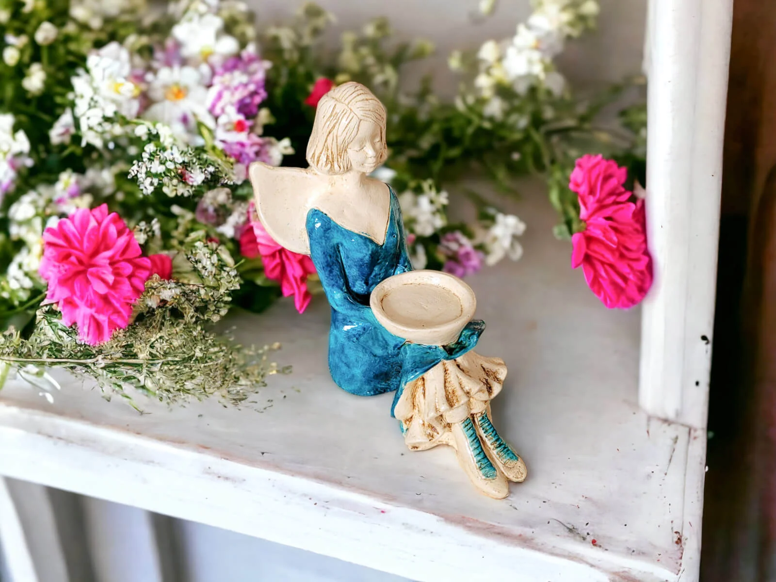 Aniołek Marion to mała dziewczynka ubrana w niebieską sukienkę i beżowo-niebieskie buciki. Na głowie ma jasne, krótkie włosy, a na plecach małe skrzydła skierowane do góry. Jest w pozycji siedzącej z głową pochyloną w dół. W rękach trzyma misę opartą na kolanach, do której można włożyć świeczkę i stworzyć magiczny nastrój. Aniołek należy do figurek stojących, dlatego można go gdziekolwiek postawić. Nadaje się na prezent dla dziecka lub kobiety. Może również służyć jako podarunek na I Komunię Świętą.