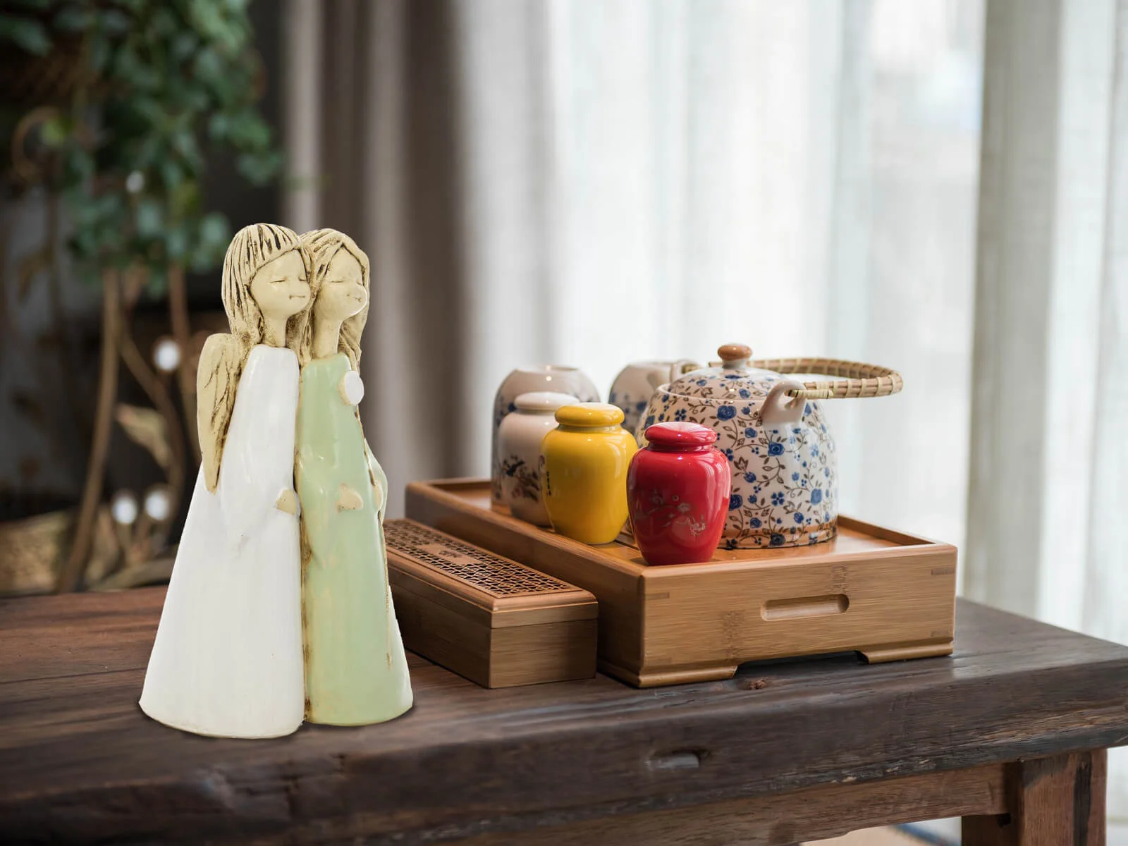 Anioł Apple & Ella to para małych dziewczynek, które prawdopodobnie są siostrami. Stoją wtulone w siebie i widać między nimi bliską więź. Mają podobne sukienki w białym i zielonym kolorze. Włosy ich sięgają do ramion, a małe skrzydełka są opuszczone w dół. Dziewczynka w zielonej sukience trzyma białego kwiatka. Figurka wykonana jest ręcznie z gipsu. Należy do figurek stojących przez co można ją gdziekolwiek postawić. Przeznaczona jest dla dzieci na urodziny lub I Komunię Świętą oraz dla kobiet.