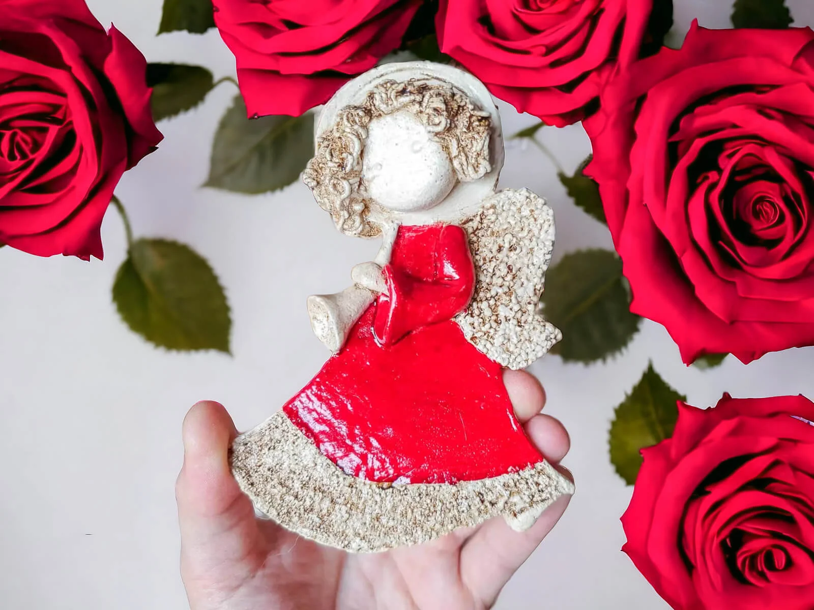 Piękna figurka dekoracyjna małego aniołka z trąbką. Aniołek jest młodą pełna energii dziewczynką. Całe dnie poświęca na graniu na swojej trąbce. Swoją muzyką zachwyca wszystkich przechodnich gapiów. Często można ją spotkać na polanie jak urządza swoje koncerty. Dziewczynka jest ubrana w długą, zwiewną czerwoną sukienkę. Ma bujne kręcone włosy. Figurka nadaje się na prezent dla dzieci.