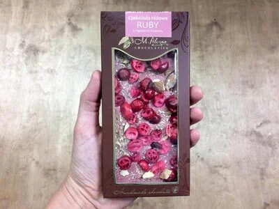 W naszej ofercie również od niedawna znajdziesz różową czekoladę ręcznie robioną w Fabryce Czekolady przez Pana Mirosława Pelczara. Różowa czekolada dostępna jest w dwóch smakach - z truskawkami i miętą oraz z migdałami i żurawiną.